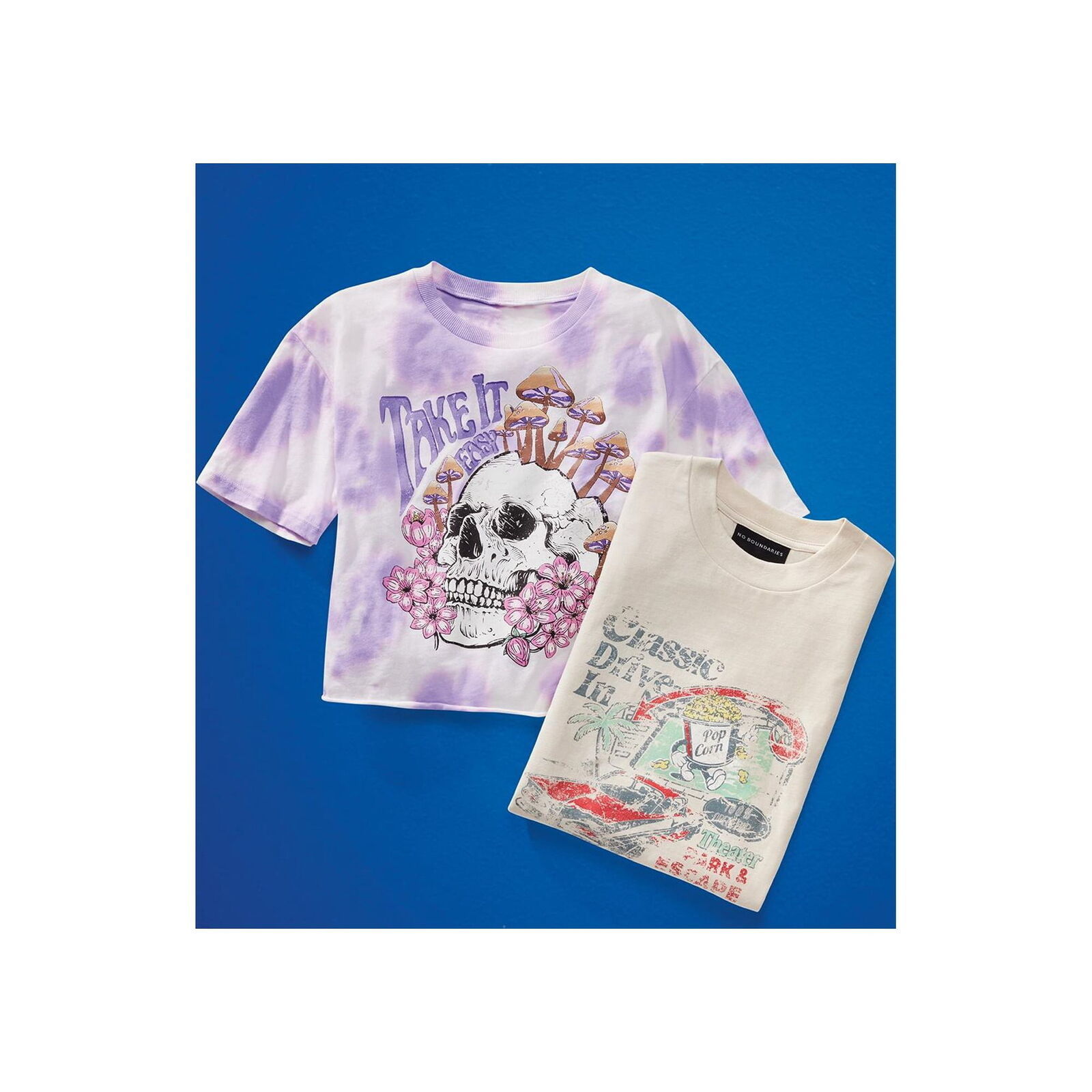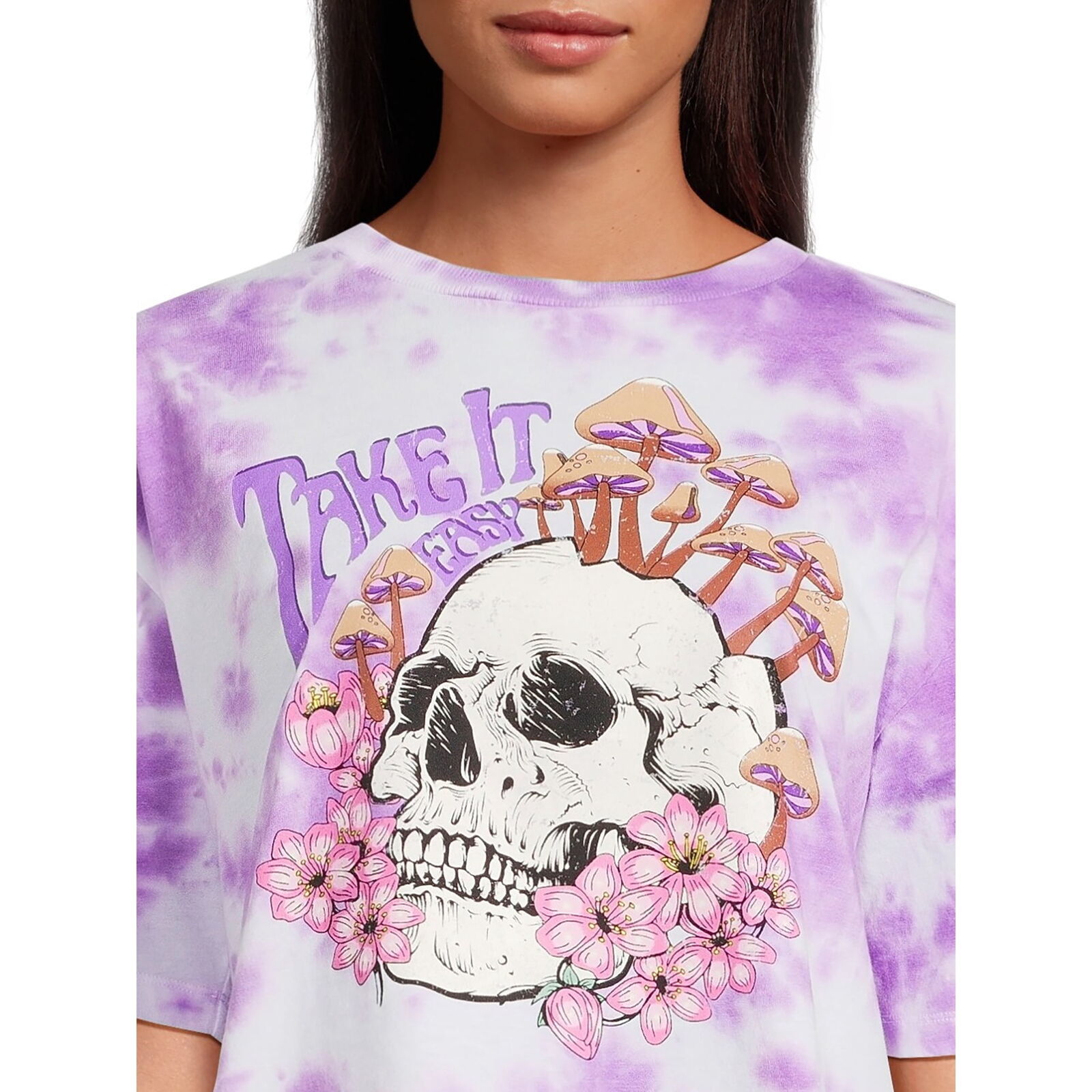 Features: Graphic at front; tie-dye pattern; raw-edge hem