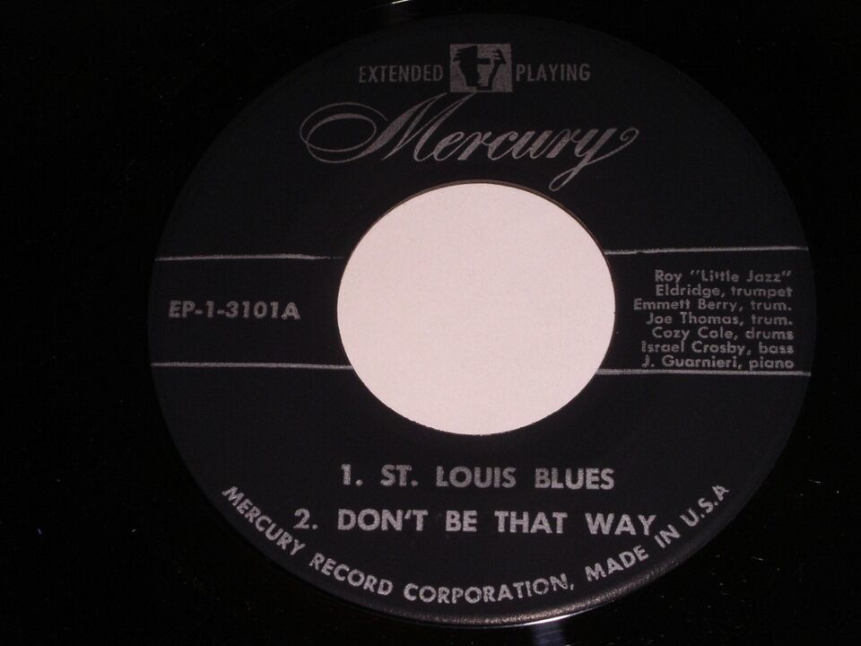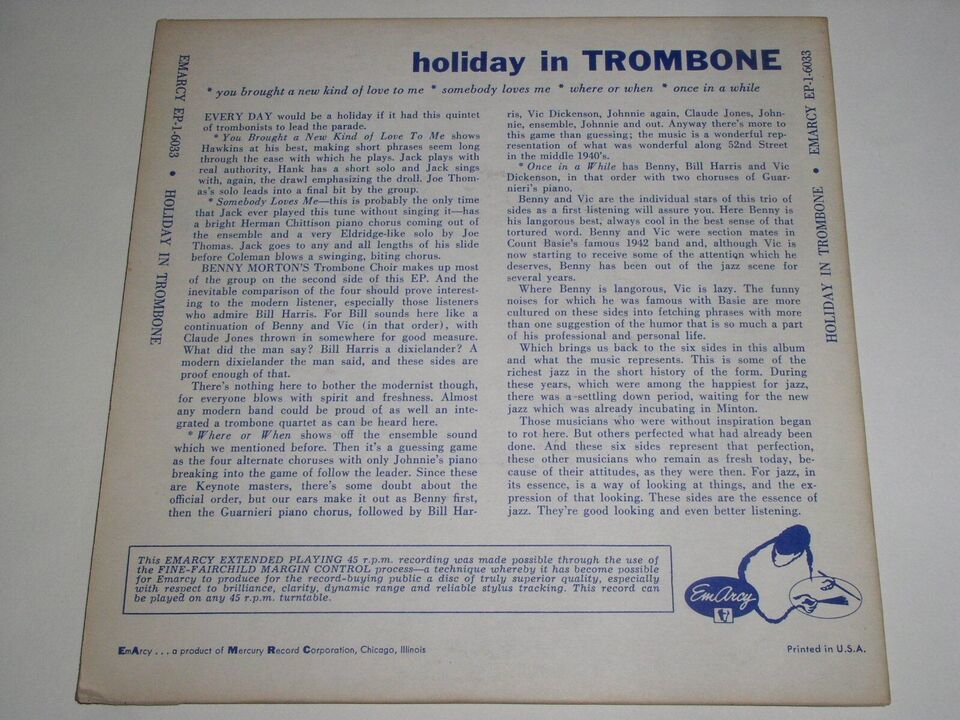 This is a very rare, vintage 7" extended play phonograph record entitled, "Holiday In Trombone". Record label: Emarcy EP-1-6033. Song titles: Somebody Loves Me, Once In A While, You Brought A New Kind Of Love To Me, Where Or When. Musicians: Roy "Little Jazz" Eldridge, Emmett Berry, Joe Thomas, Cozy Cole, Israel Crosby, J. Guarnieri. Note: This is the 7" ep, not the 10" record.