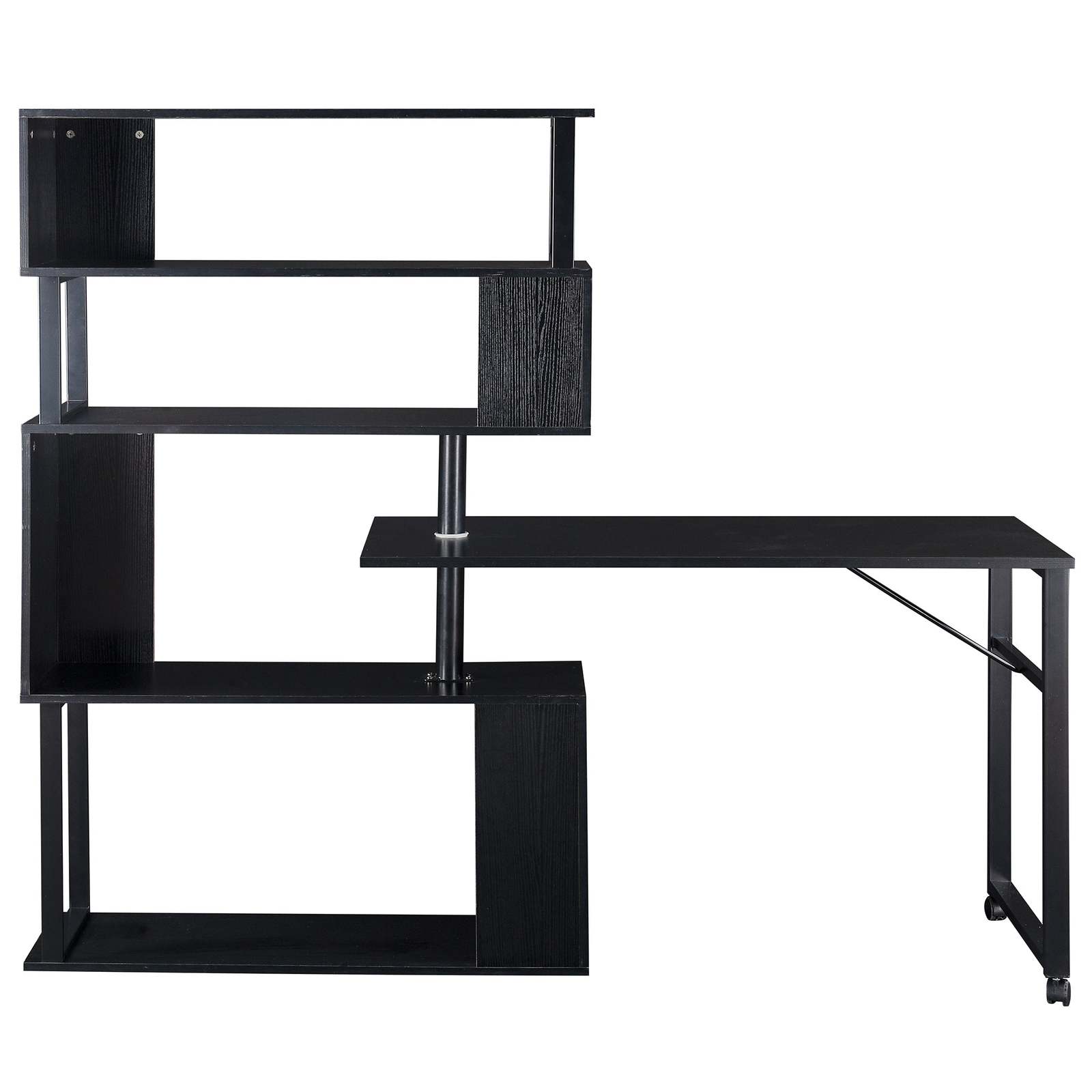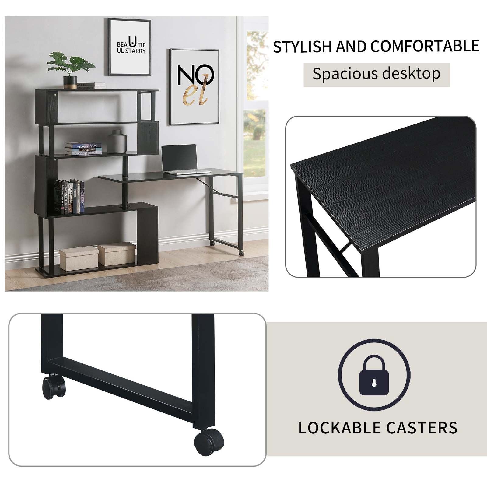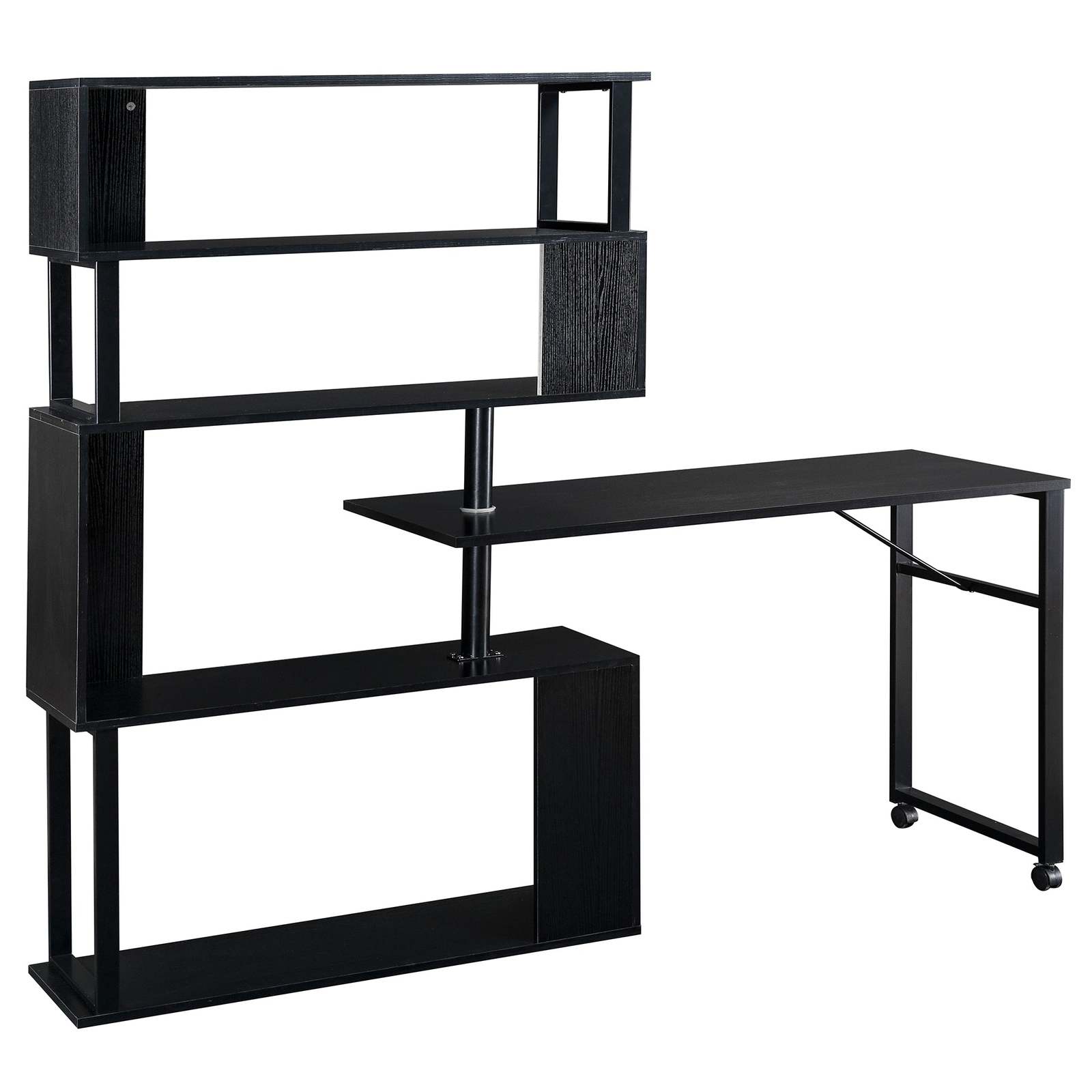 L-Shaped Corner Desk w/ Bookshelf & Wheels (Black)