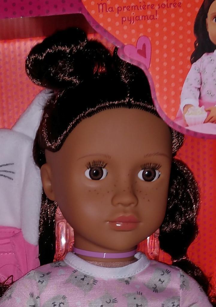 New in box. For ages 3 years old and up. Larissa has wavy brunette hair and cute freckles and brown eyes that open and close. She has a huggable soft body with a movable head, arms, and legs to easily change her outfit during dress-up. Larissa is wearing a kitty-themed pajama and a pair of slippers. This set includes a kitty-themed sleeping bag, a bowl of popcorn, 2 cookies, a glass of chocolate milk, 2 bottles of pretend nail polish, and a full face mask with 2 cucumber slices. Her outfit has easy-open closures to quickly put on and remove. Comes from a smoke- free home. Thank you for stopping by~!~!~