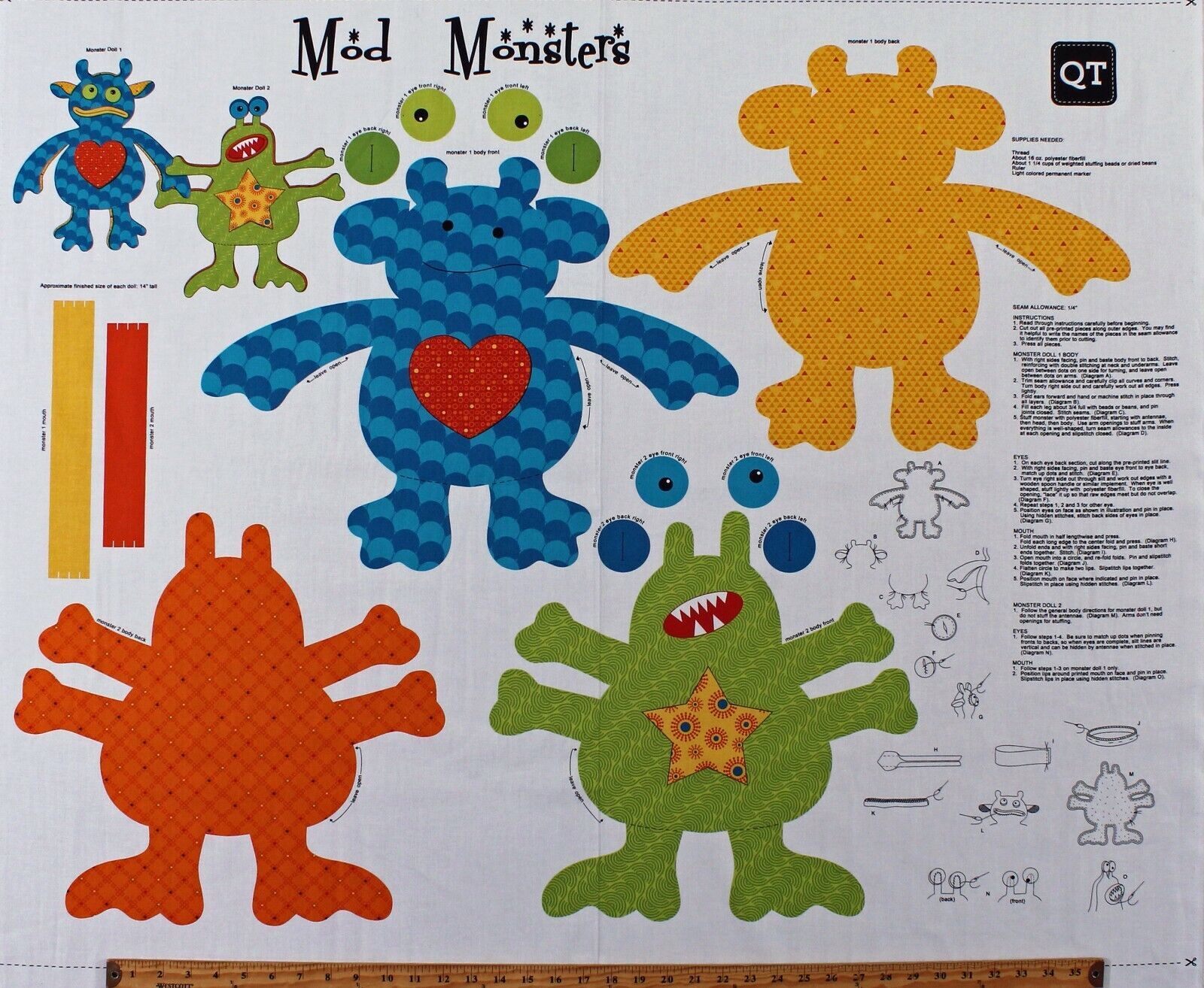 35" X 44" Panel Mod Monsters Stuffed Toys Kids Sew & Go Cotton Fabric D477.62