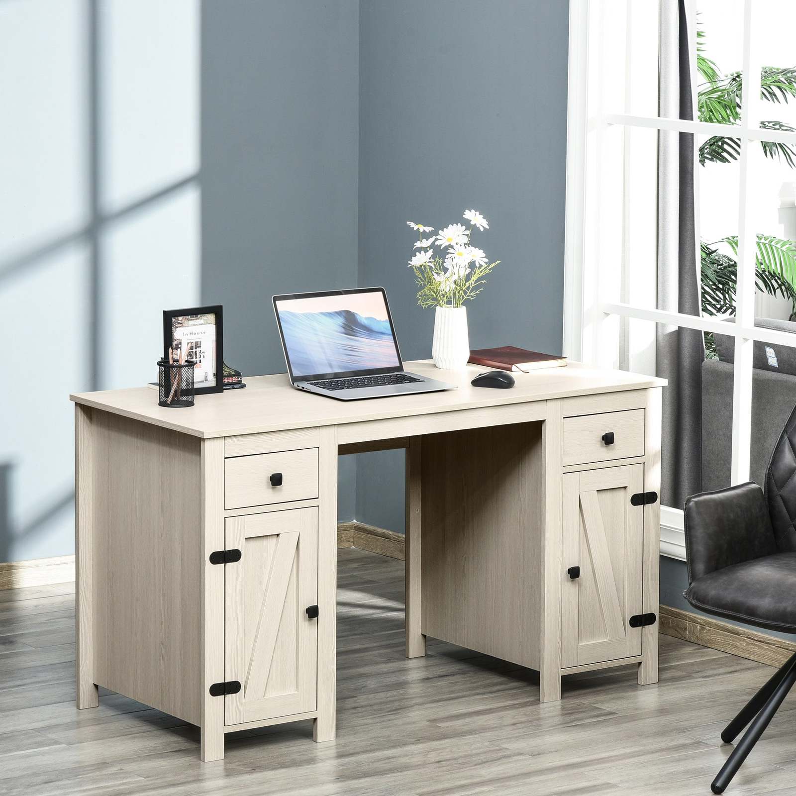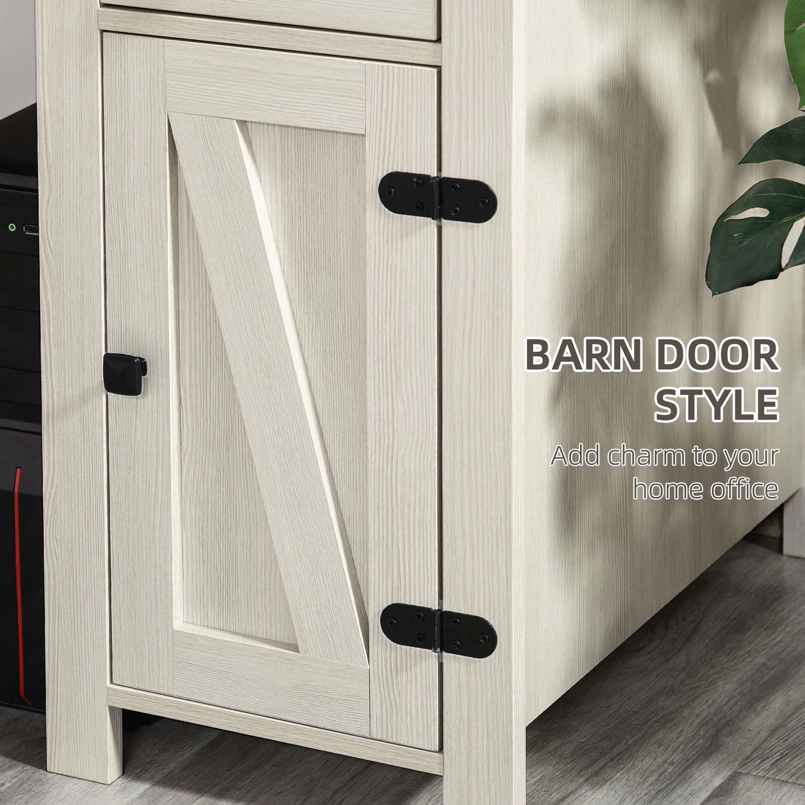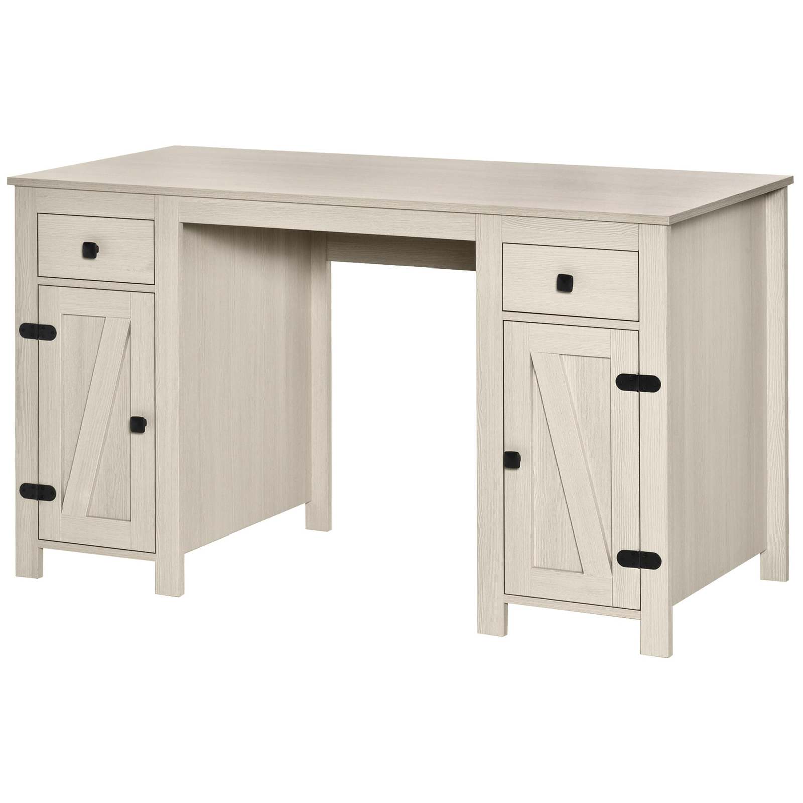 Farmhouse Style: The study desk is designed with cross barn doors, wood grain texture and polished metal accents to add charm to your home office.