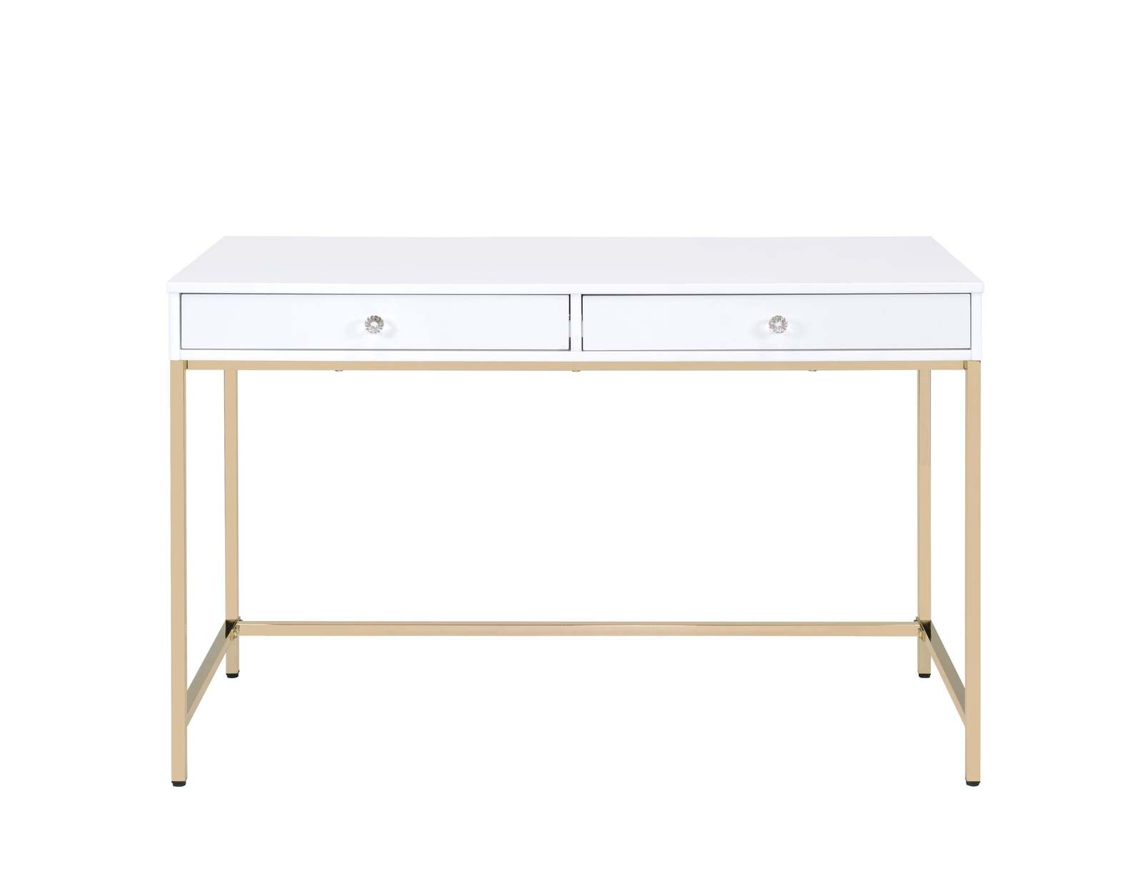 Supported by a striking gold metal leg base with an open design, the desk adds a touch of luxury and sophistication to any room. The two storage drawers feature smooth, side metal glides for easy access and are finished inside for a clean, polished look, while the crystal-like single knob provides a subtle yet stylish hardware accent.