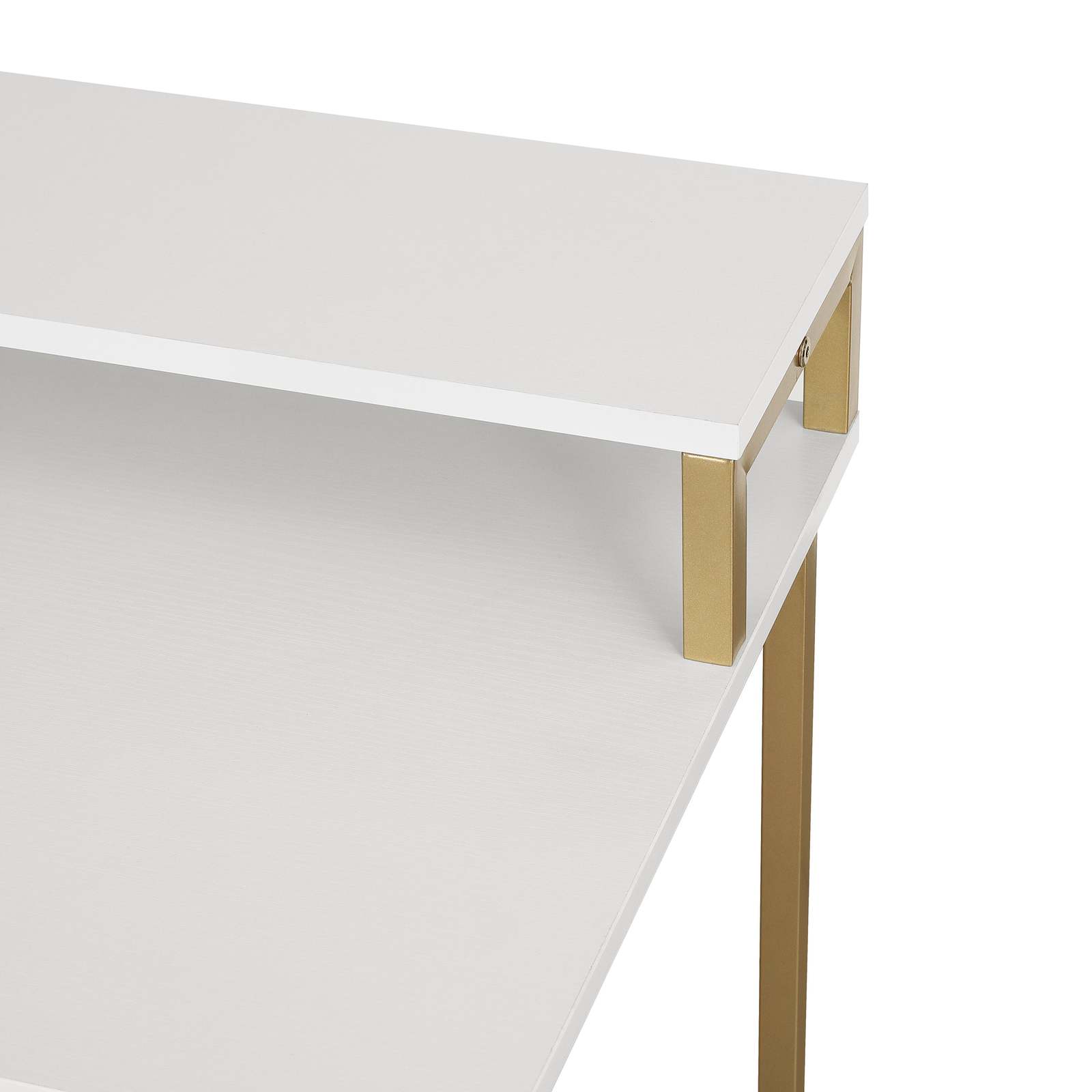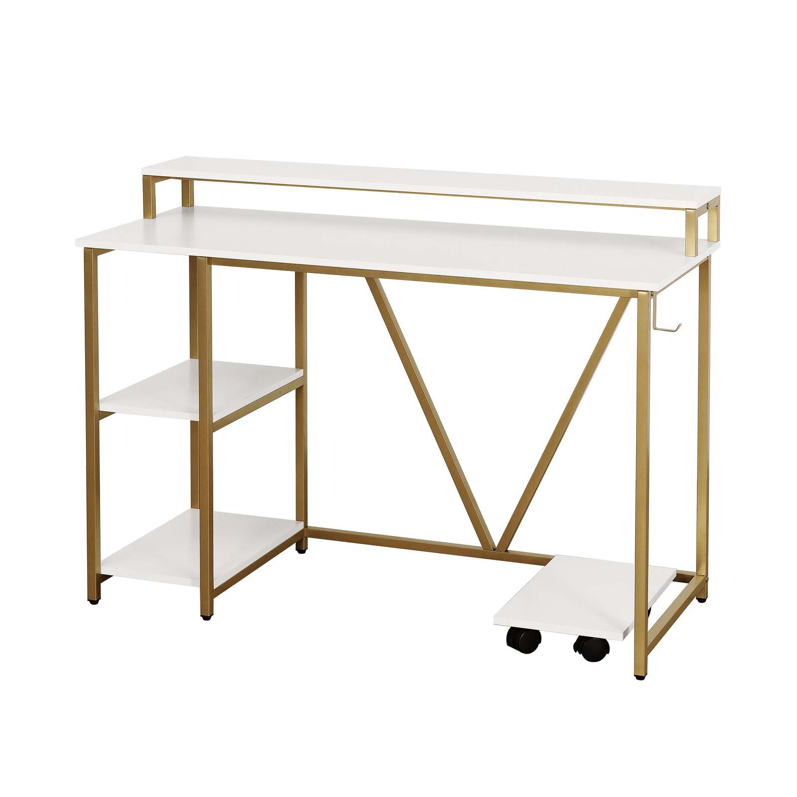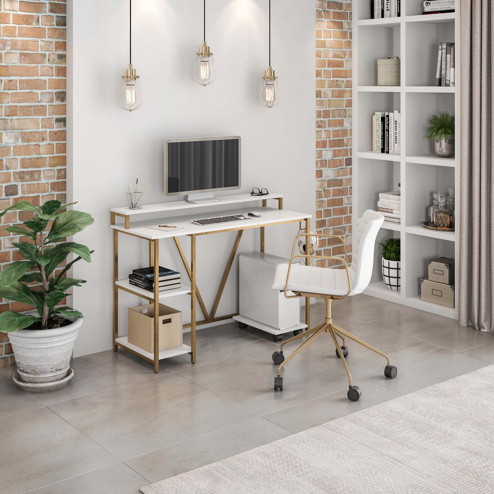This writing desk features a clean-lined silhouette with a two-tier side open shelf plus an elevated hutch-like shelf giving your home office a modern industrial look. The engineered wood surfaces showcase a rich white wood grain hue with sturdy steel frame that brings some industrial vibes to your workspace. It includes a powder-coated steel frame adding plenty of support, plus a small side holder hook to hang your headphones , or any other accessories. It also includes a convenient mobile CPU Caddy to elevate your CPU box off the floor.