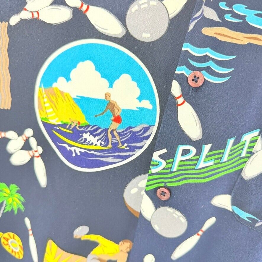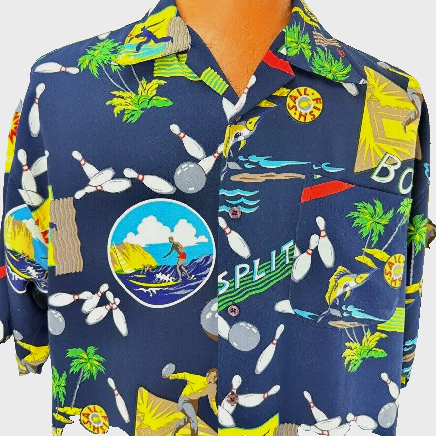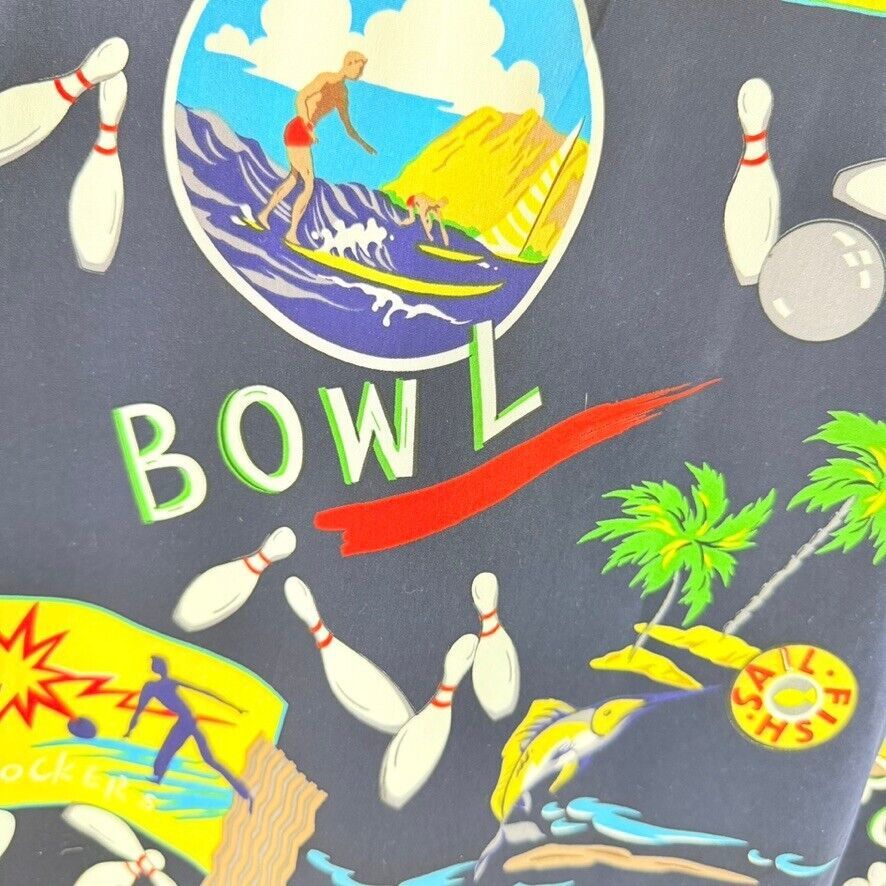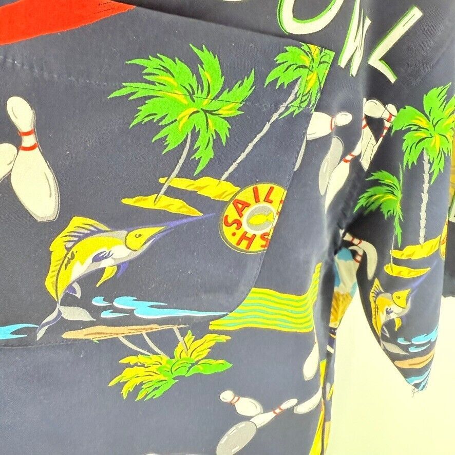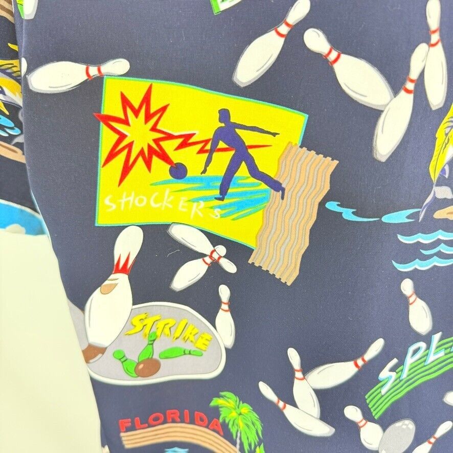 Koman Sport Hawaiian Aloha L Shirt Bowling Pins Surfing Islands Palm Trees