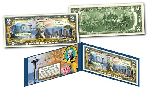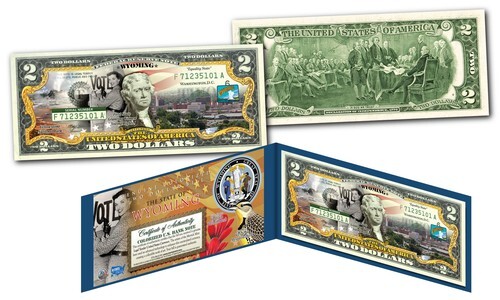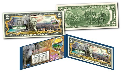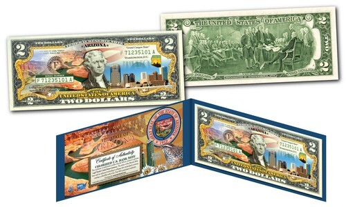 This specially priced GRAND CANYON NATIONAL PARK uncirculated Two-Dollar Bill is Genuine Legal Tender of the United States, which has been enhanced with beautiful images of the GRAND CANYON. The colorized images are accomplished through a revolutionary new authentic genuine colorization process pioneered by The Merrick Mint, creating a collectible work of art. Only genuine Legal Tender $2 United States Bills are used for this unique colorization process. Each $2 Bill is in FRESH, CRISP, UNCIRCULATED condition, and was directly removed from untouched wrapped Federal Reserve sealed packs. Former U.S. President Thomas Jefferson is featured on the obverse of the note, along with the special colorization overlay. The Signing of the Declaration of Independence by John Trumbull is featured on the reverse. It is the only U.S. Currency note that features two Presidents, John Adams and Thomas Jefferson, and it is one of the most rarely seen BILLS in circulation and actual use.