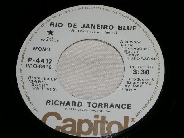 This is the original, vintage promotional 45 rpm release of Richard Torrance's, "Rio De Janeiro Blue". This is the mono/stereo issue. Record label Capitol P-4417.