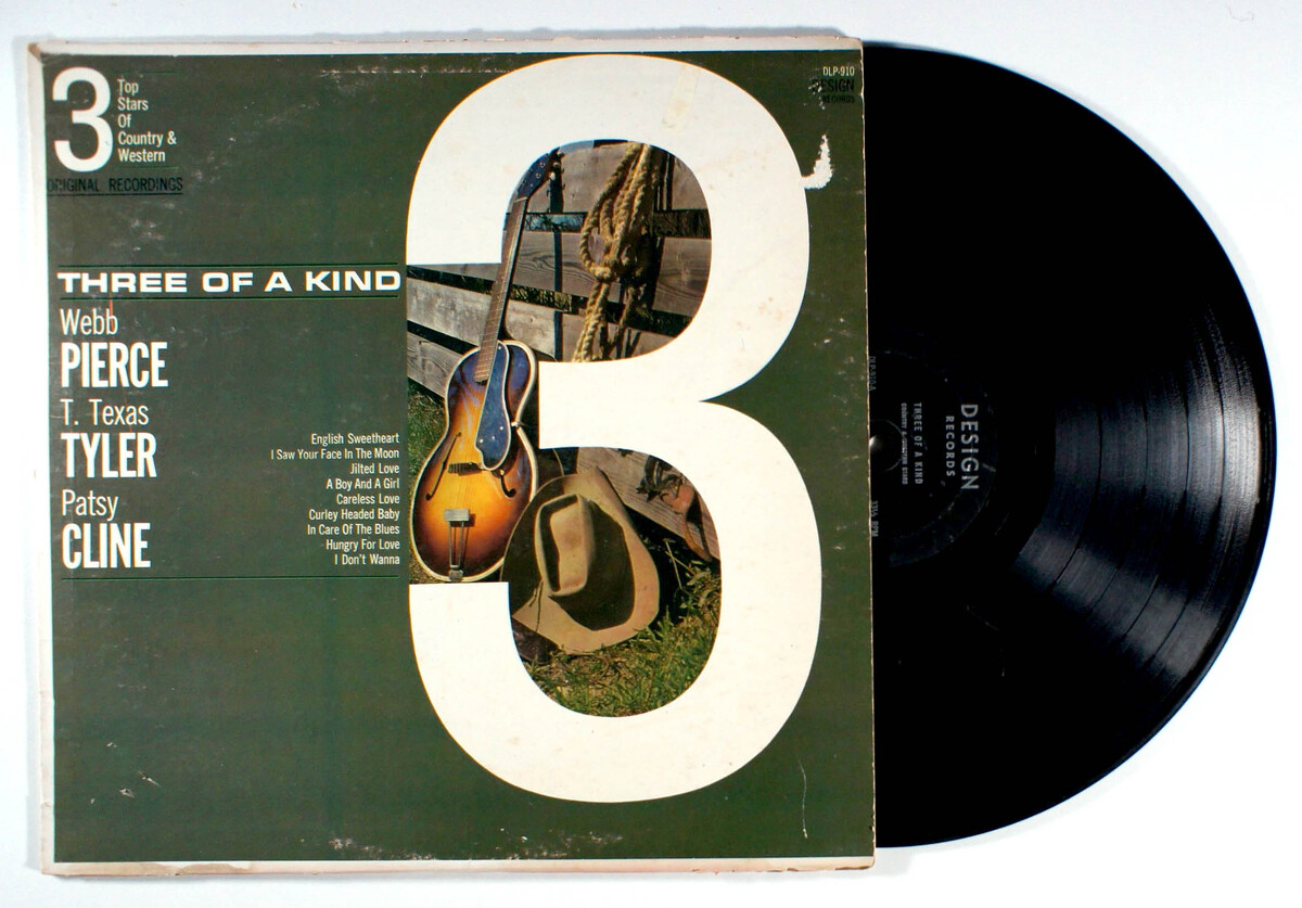 Three of a Kind is a country western version of a concept in entertainment from the sixties that combined three entertainers' performances onto one vinyl to provide customers with a good value. This record features Patsy Cline's 1957 single I Don't Wanna as well as two other songs. Also included are three songs each from superstars Webb Pierce and T.Texas Tyler.