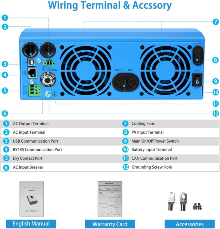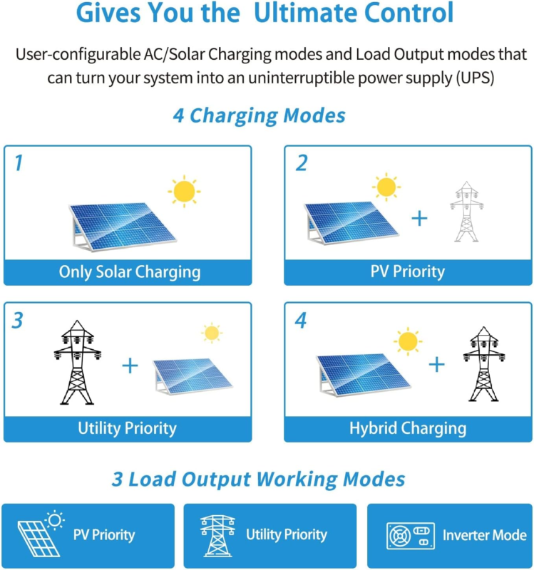 ?Uninterruptible Power Supply?: If main/generator disconnected or the solar charging insufficient, the Inverter Charger takes over the battery supply to the alternative option within 10ms, which will not let your electronics shut down.