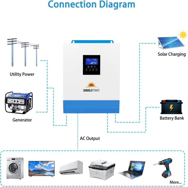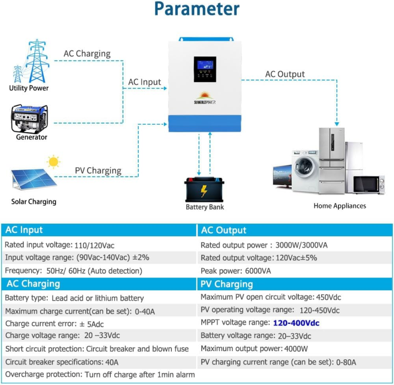 ?All-in-one solar charge inverter?: SUNGOLDPOWER 3000W DC 24V Solar Inverter Charger Combined with 80A MPPT solar Charging and 40A AC battery charging ,you can enjoy the stable power from the sun and the utility grid to keep you powered under any circumstances.