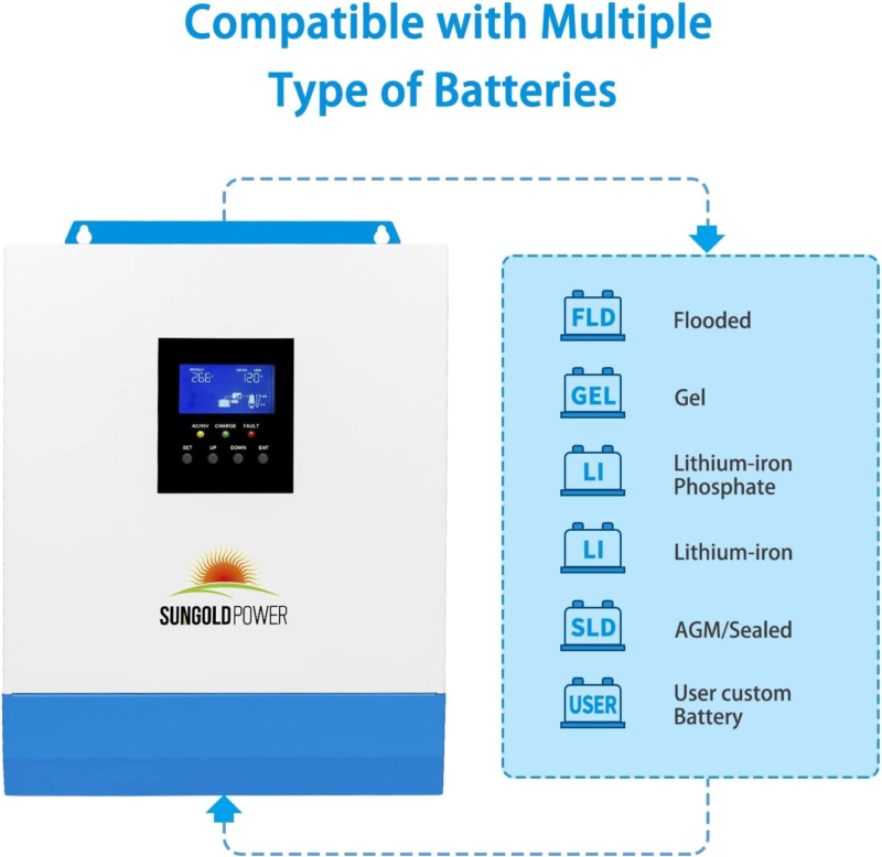?Charging different Batteries?: SUNGOLDPOWER 3000 Watt DC 24 volt Solar Inverter is compatible with 24V AGM/Sealed, Gel, Flooded, Lithium batteries and a User Mode for custom inputs to work with virtually all battery types.