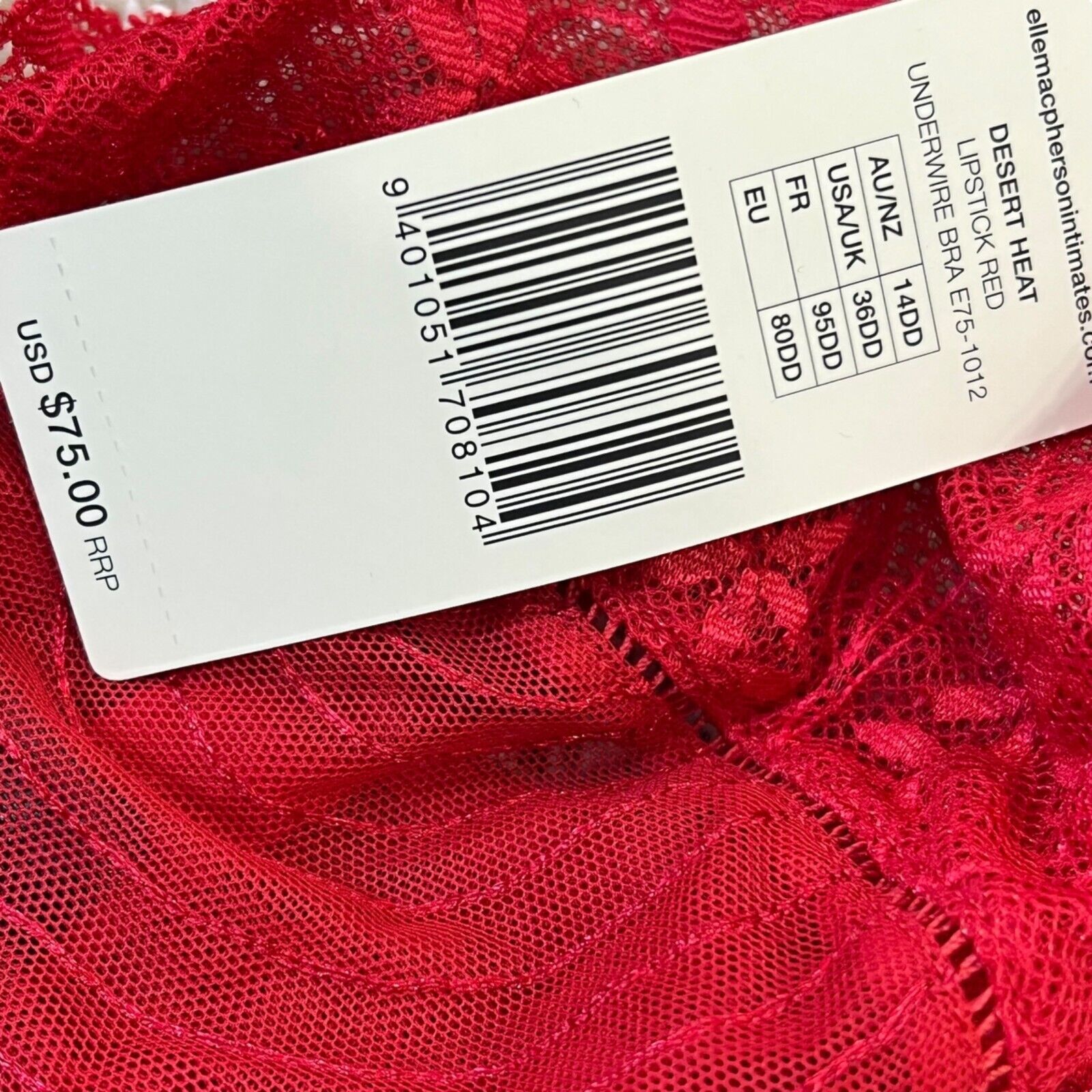 Elle Macpherson Desert Heat Lipstick Red Lace Underwire Bra 36DD Luxury Lingerie