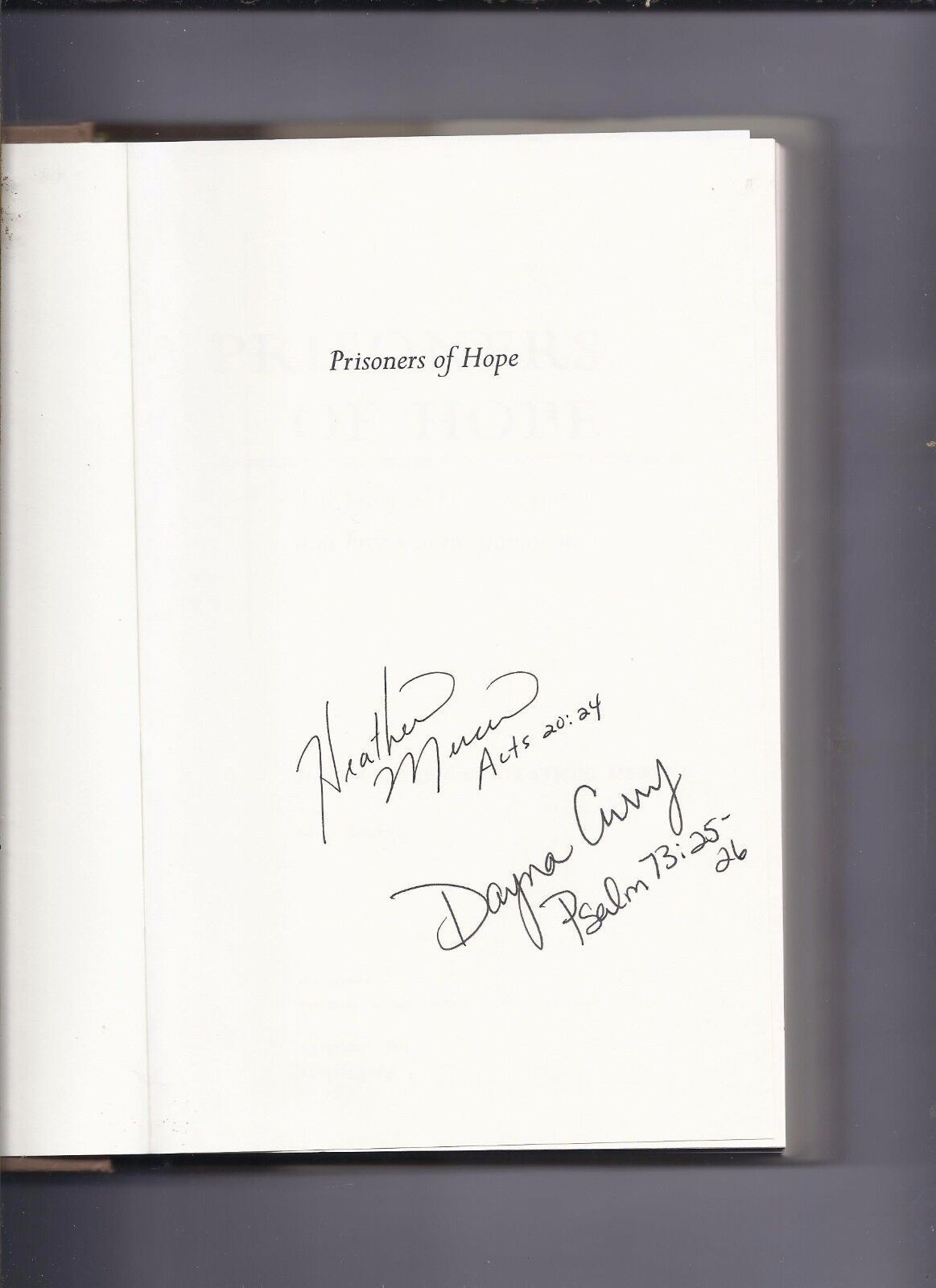For Sale is a Rare and Very Hard to FInd Prisoners Of Hope The Story of our Captivity and Freedom in Afghanistan By Dayna Curry Heather Mercer Signed book. all autographs are obtained in person at games, practices, golf tournaments, airports, theaters, arenas, airports and Signings. it will be accompanied by a COA from our company. Please ask Any and All Questions prior to purchasing. Fast Same or Next day shipping with Free Delivery Confirmation within the U.S. Payment Due within 7 days of purchase (if you need more time please let us know In advance) we love to combine shipping is always a Yes and Most of the time Additional Items Ship for free.