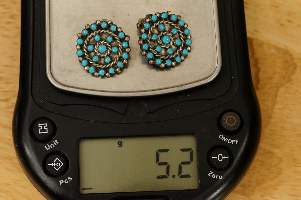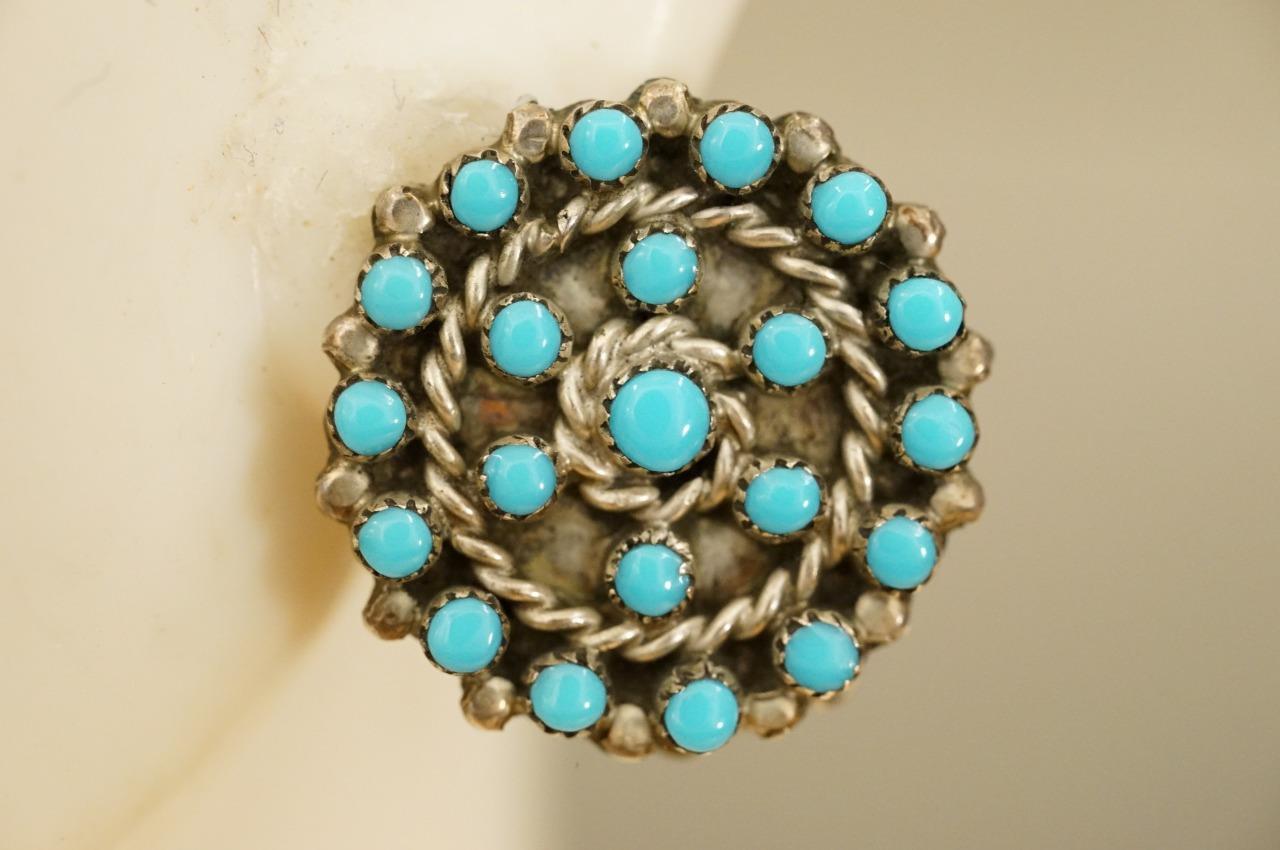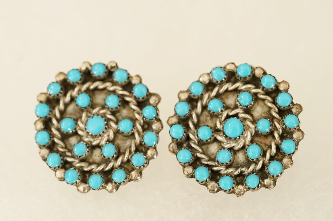IB Zuni Sterling Silver 925 Jewelry TURQUOISE Gemstone Petit Point Earrings. Clip earring style. Measures 17mm in diameter. Will need a gentle polish.