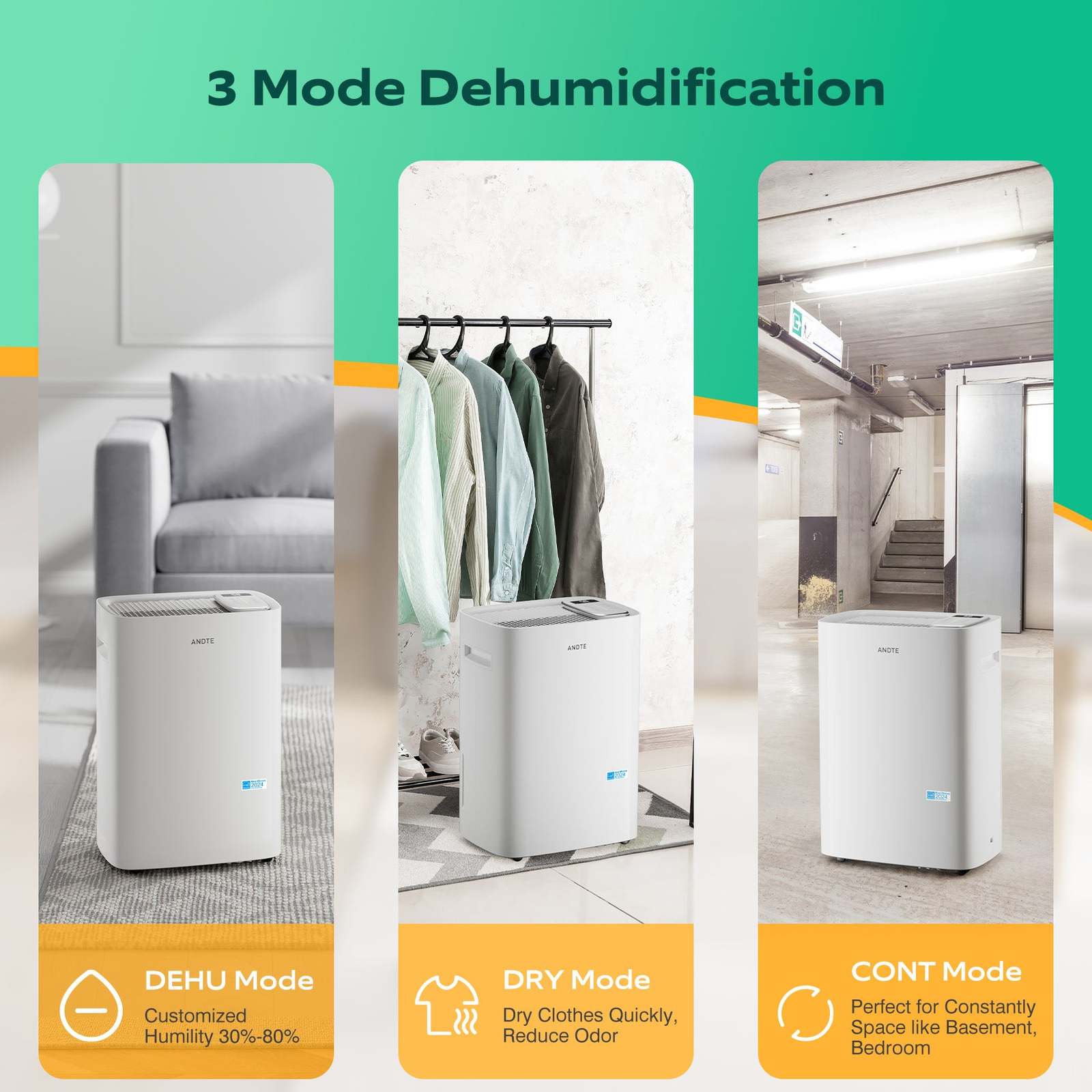 3 Dehumidification Options: The dehumidifier support 3 Modes. DEHU mode to perfectly maintain your desired humidity level in the wine cellar. DRY mode to quickly dry delicate clothes that need to be hung for drying. the CONT mode is perfect for constantly damp spaces. Set your desired humidity level, when it reaches the humidity, it will automatically stop working.