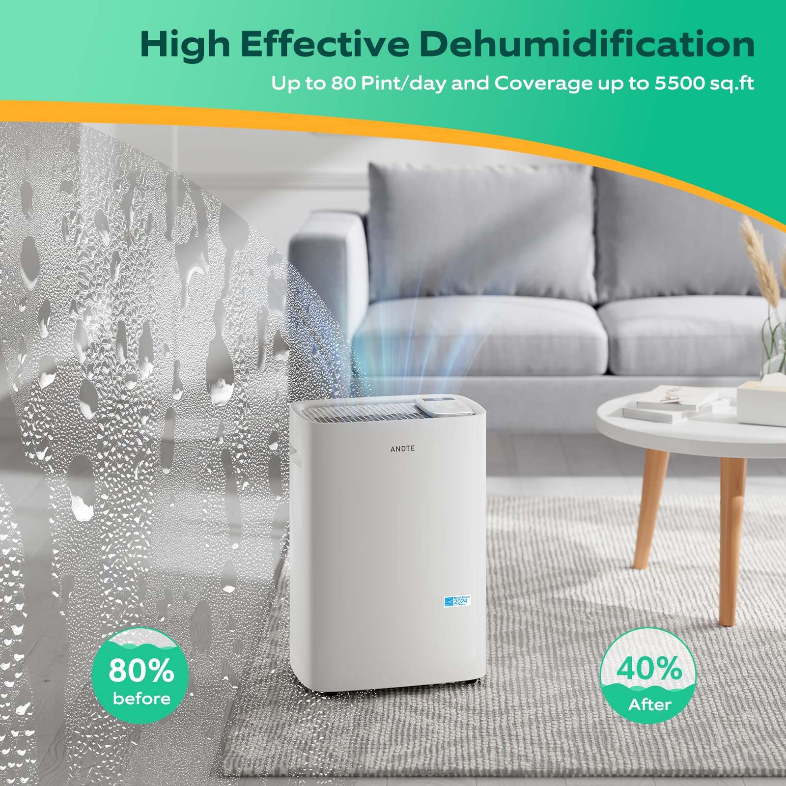 5500 sq.ft Efficient Home Dehumidifier: Our dehumidifier removes up to 80 pints (95?, 90% RH) of moisture per day with an adjustable humidity setting from 30% to 80%. Perfect Home Dehumidifier for basement, bathroom, bedroom, office, kitchen, cellar, or crawlspace. Dehumidifier with Drain Hose for Large Room up to 5500 sq ft. Notice: 80 Pint not means the capacity of the water tank.
