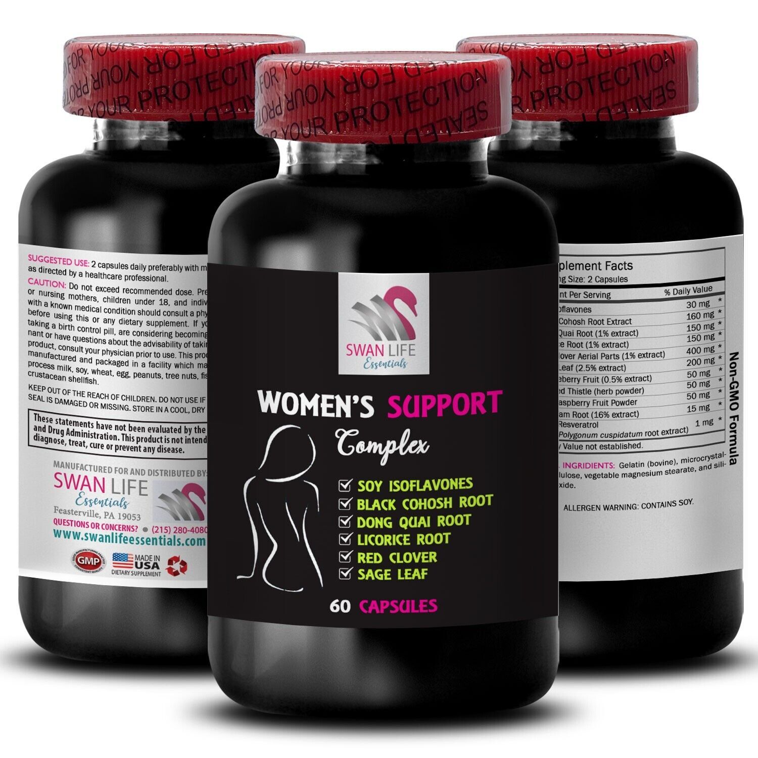 WOMEN'S SUPPORT COMPLEX: Our powerful dietary supplement designed to support a balanced internal environment and promote optimal well-being. This advanced formula combines the natural benefits of Soy Isoflavones, Black Cohosh Root Extract, Dong Quai Root, Licorice Root, Red Clover Aerial Parts, Sage Leaf, Chasteberry Fruit, Blessed Thistle, Red Raspberry Fruit Powder, Wild Yam Root, Trans-Resveratrol with a blend of potent ingredients known for their properties.