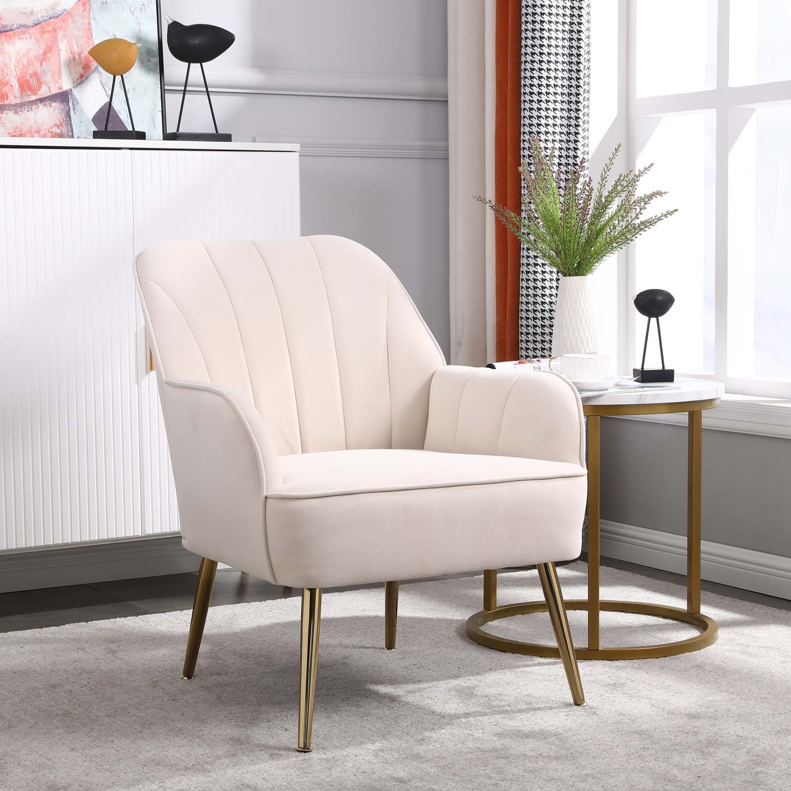 Design: Subtly curved arms, golden legs, and exquisite cutting and stitching details make this clean-lined accent chair and cute ottoman set the best pick in modern families.