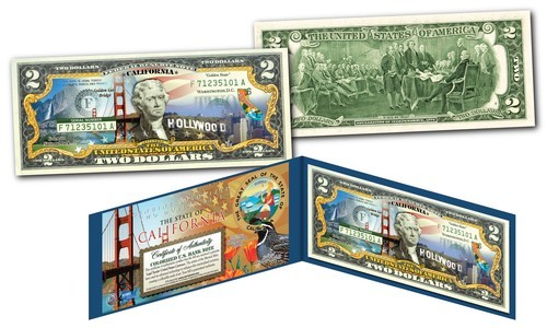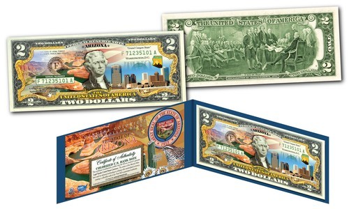 This uncirculated $2 Bill is Genuine Authentic Legal Tender of the United States, which has been enhanced with beautiful colorized images of LAS VEGAS. The full colorized images are accomplished through a revolutionary new authentic genuine colorization process pioneered by The Merrick Mint, creating a collectible work of art. Each bill comes displayed in a blue folio with a Certificate of Authenticity to guarantee that your bills are authentic and recognized by every monetary authority around the world, therefore assuring its Collector Edition status. Each $2 Bill is in FRESH, CRISP, UNCIRCULATED condition, and was directly removed from untouched wrapped Federal Reserve sealed packs. Former U.S. President Thomas Jefferson is featured on the obverse of the note, along with the special colorization overlay. The Signing of the Declaration of Independence by John Trumbull is featured on the reverse. It is the only U.S. Currency note that features two Presidents, John Adams and Thomas Jefferson, and it is one of the most rarely seen BILLS in circulation and actual use.