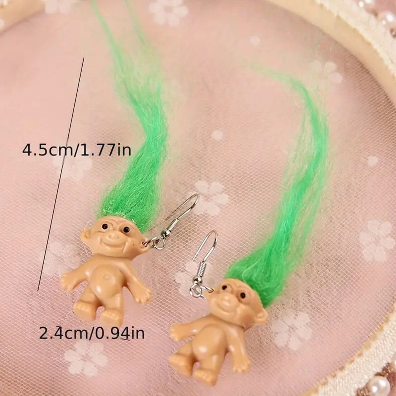 Cute Retro TROLL DOLL Funky EARRINGS Miniature Toy Kawaii Novelty Jewelry-GREEN