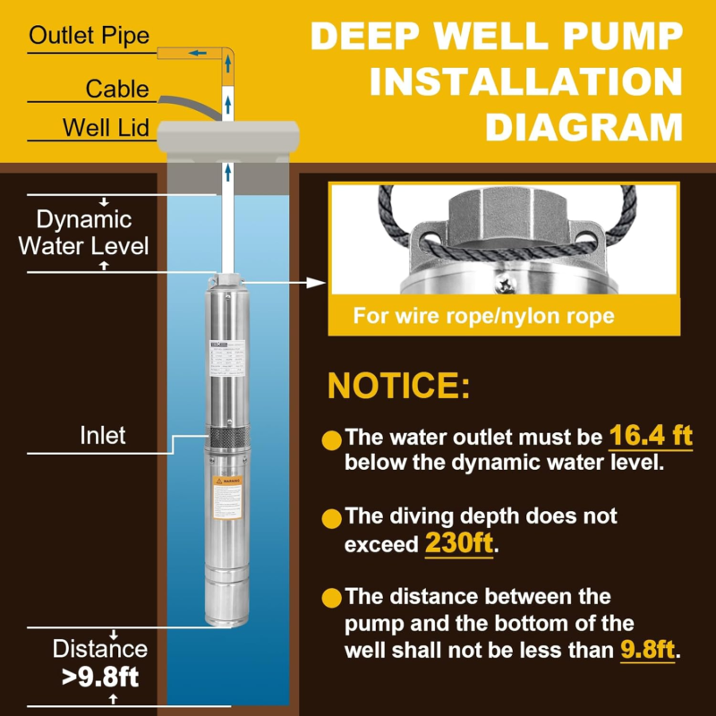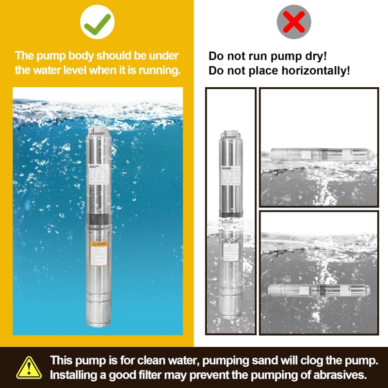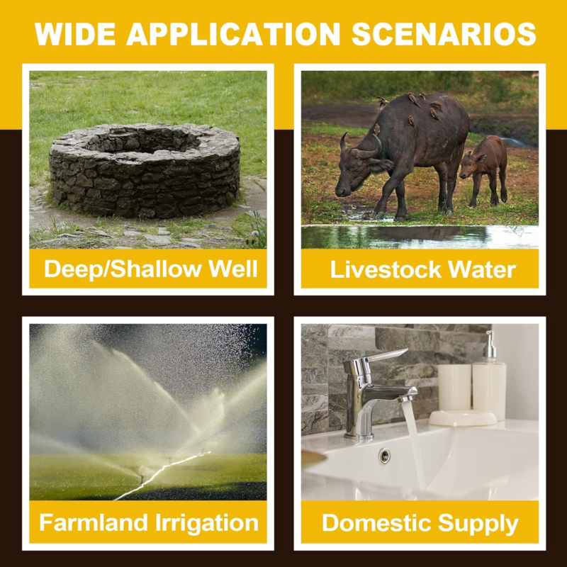 ?WIDELY USED?Deep well pumps require vertical installation.NOTE:It is prohibited to use with no water.Suitable for villages, households, farms, camping vehicles, water supply, etc.