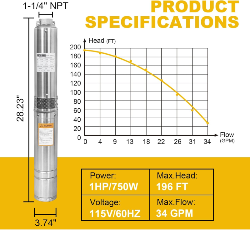 ?ESSENTIAL PARAMETER?Stainless Steel Submersible Deep Well Pump rated voltage: 115V/60HZ;Rated power:1HP;Max flow:34GPM;Max head:196ft;Outlet:1-1/4" FNPT;For 4 inch well casings and bigger.