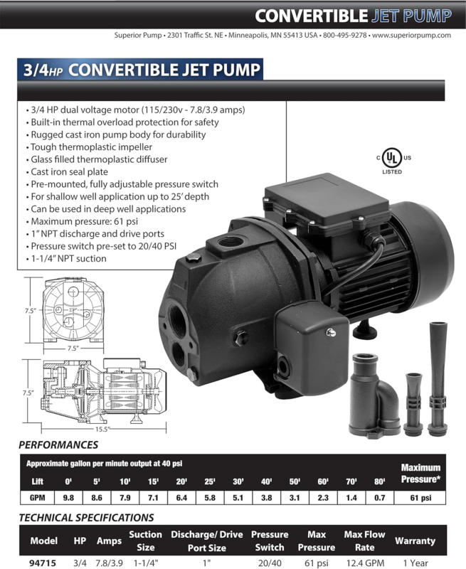 Superior Pump builds pumps that are truly Built to Last with quality components and are 100 percent factory tested. The 94715 3/4 HP convertible jet pump features a rugged cast iron pump body for durability. Can be used in shallow well (shallow well max depth 25 ft.) or deep well applications (deep well max depth 80 ft.). This pump features a pre-mounted, fully adjustable pressure switch preset at 20/40 psi. A dual voltage motor, with built-in thermal overload protection, can be set for 115-Volt or 230-Volt. Tough thermoplastic impeller and glass filled thermoplastic diffuser are designed to move up to 9.8 gallons per minute at 40psi. The pump is built using a cast iron seal plate and offers 1-1/4 inch NPT suction/1 inch NPT discharge. Deep well ejector kit included.