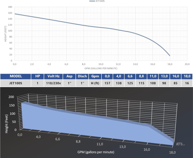 JET100s Shallow Well Jet Pump, Self Priming, Stainless Steel Body Pump, 1 Hp, 230 V, Cooper Winding, 138ft Head, 15gpm Flow, 304 S. Steel Shaft Intorducing our self-priming stainless steel electric pumps with a built-in ejector. With a compact and elegant design, they are suitable for pumping clean water free from impurities in multiple applications. Key Features: SS304 stainless steel pump body. Copper winding. Brass impeller. Stainless steel shaft. Single-ph?