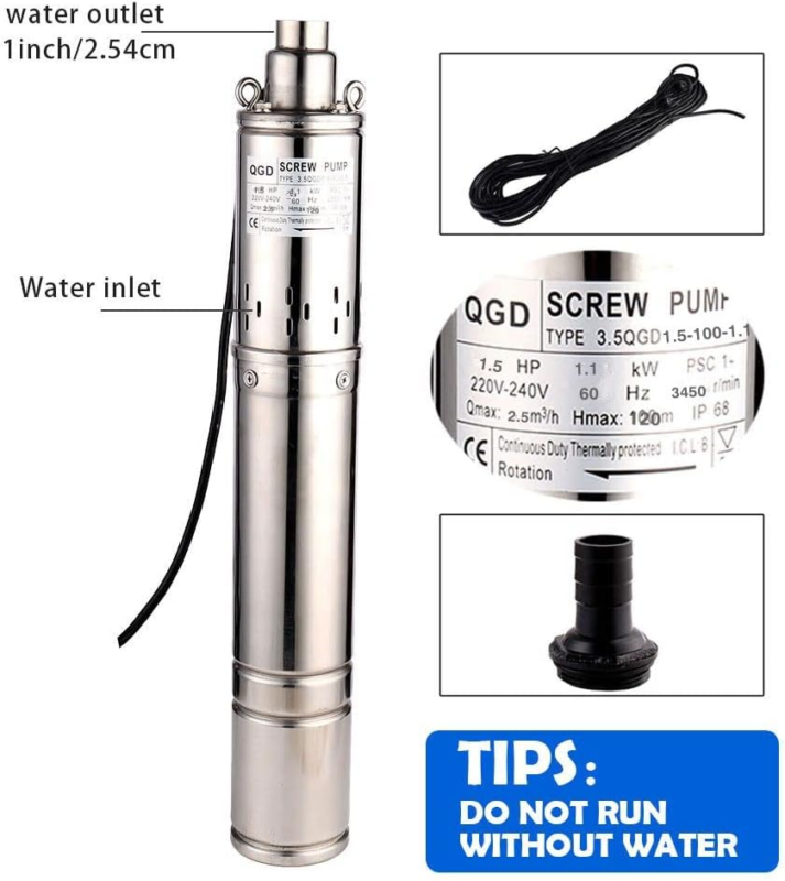 ??About The Pump?:Submersible well pump 220-240V/60Hz; Plug Type: US Plug; Rated power: 1.1kw 1.5hp; Outlet: 1 inch;Pump Max. flow rate: 2.5m/h, 11GPM; Pump Max. head: 120m/394ft;The length of cable: 15m (49.2ft);Pump Head:304 stainless stee;l? NOTE: Please confirm whether the voltage and frequency compatible with your local standards before you order and NOTE: It is prohibited to use with no water.The well outlet min size have to be more than 90mm is better.