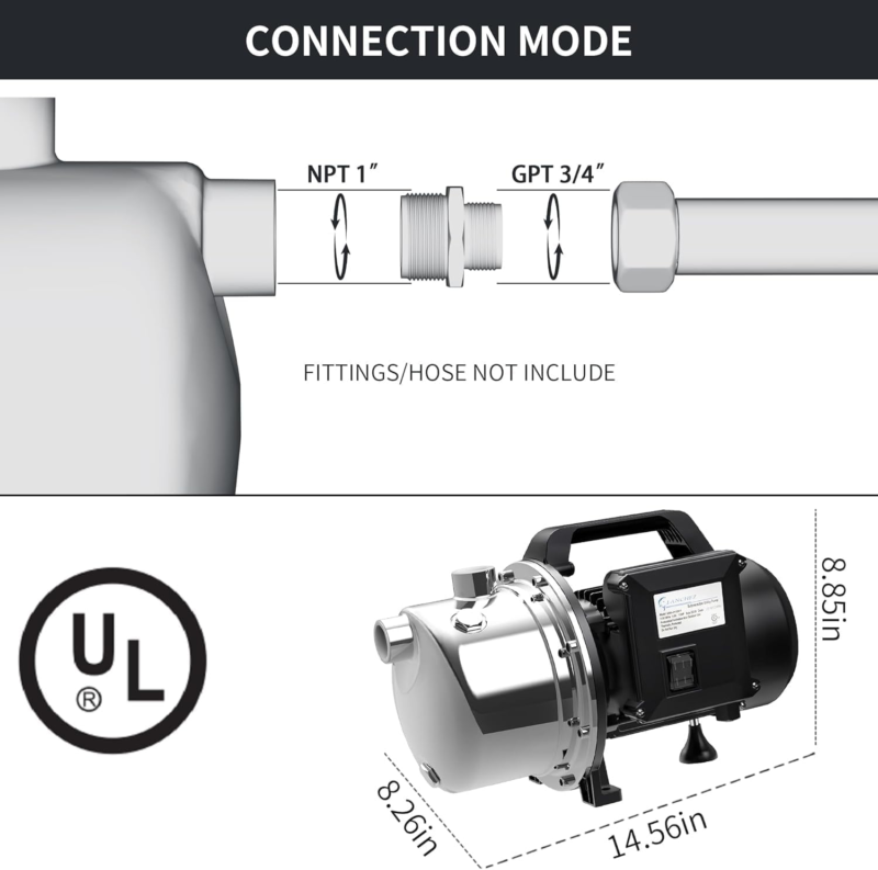 ?Strong and Reliable Performance?The UL certificated shallow well pump with 1 HP powerful motor of copper coils, which is more stable, durable and quiet than aluminum coil on the market, ensures strong performance in a low energy consumption, can offer maximum flow rate up to 1294 GPH and max lift water up to 147 feet