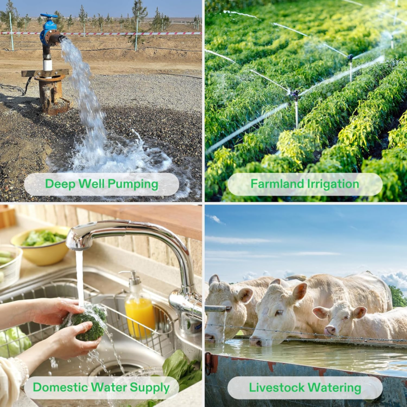 Applicable in Multiple Scenarios: This pump allows you to extract water from deep wells, reservoirs, canals or rivers, supplying water for farms, farmlands, home, factories; 33ft Power cord makes it more flexible to use