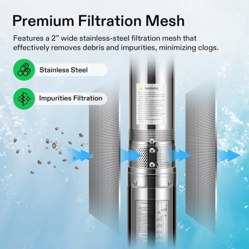 Premium Filtration Mesh: This pump features a 2? wide stainless-steel filtration mesh that effectively removes debris and impurities, minimizing clogs; If your water contains too many impurities, add a layer of gauze in front of the filtration inlet to keep large debris out