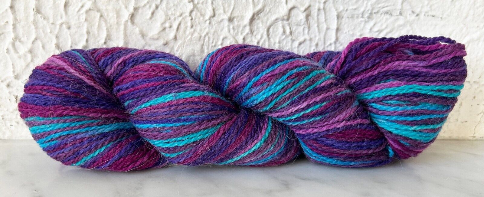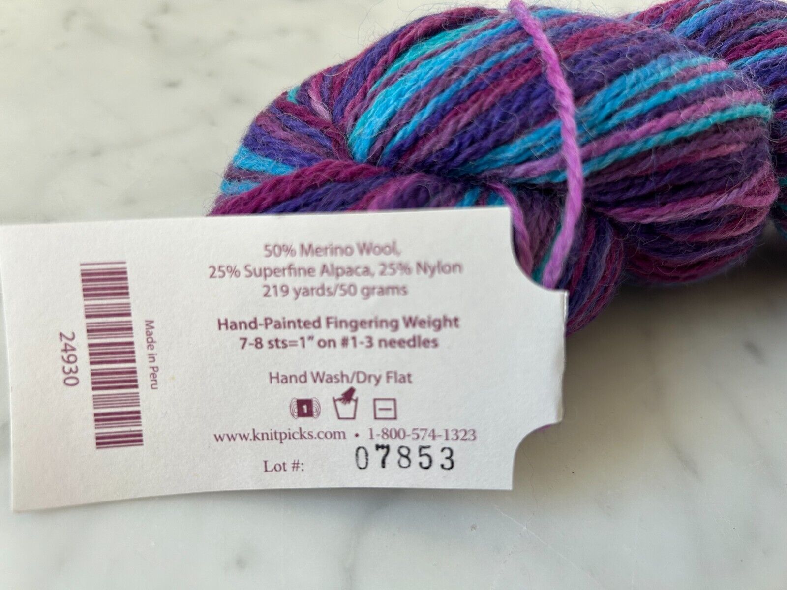 One skein of Knit Picks Imagination hand-painted fingering weight yarn. Color Fairy Princess #24930. 50% Merino Wool, 25% Superfine Alpaca, 25% Nylon; hand wash and dry flat.