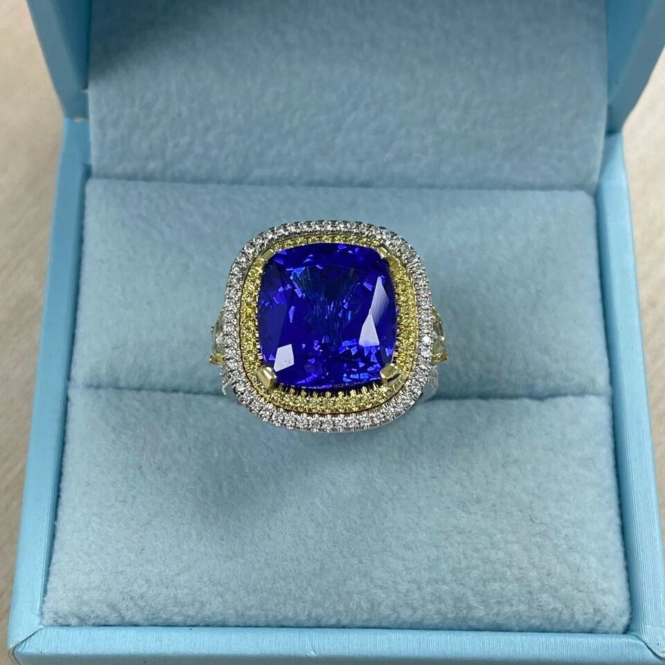 Art deco design engagement ring features a GIA certified 8.68 carat blue violet cushion brilliant cut tanzanite surrounded by a double halo of colorless and yellow round brilliant cut natural diamonds in micro pave setting. Additional diamonds line the triple split shank with 0.78 carat 2 trapezoid cut natural intense yellow natural diamonds completing the shimmering elegance of this ring!! The ring is crafted of 14-karat two tone gold that shines with a high polish finish. The total carat weight is 10.34 carats.