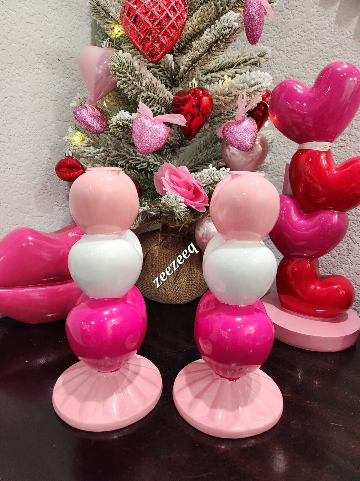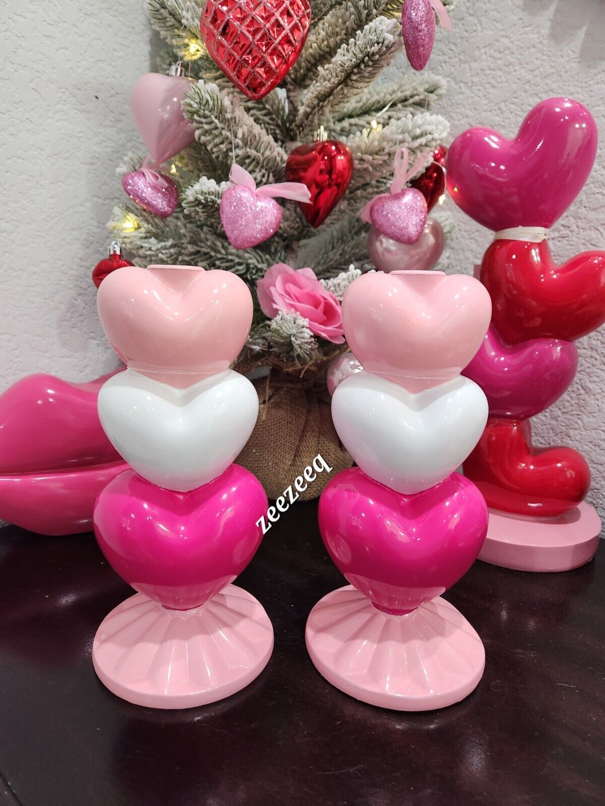 Valentines Day Pink Hearts Resin Candle Holders Set Tabletop decor 9" NEW