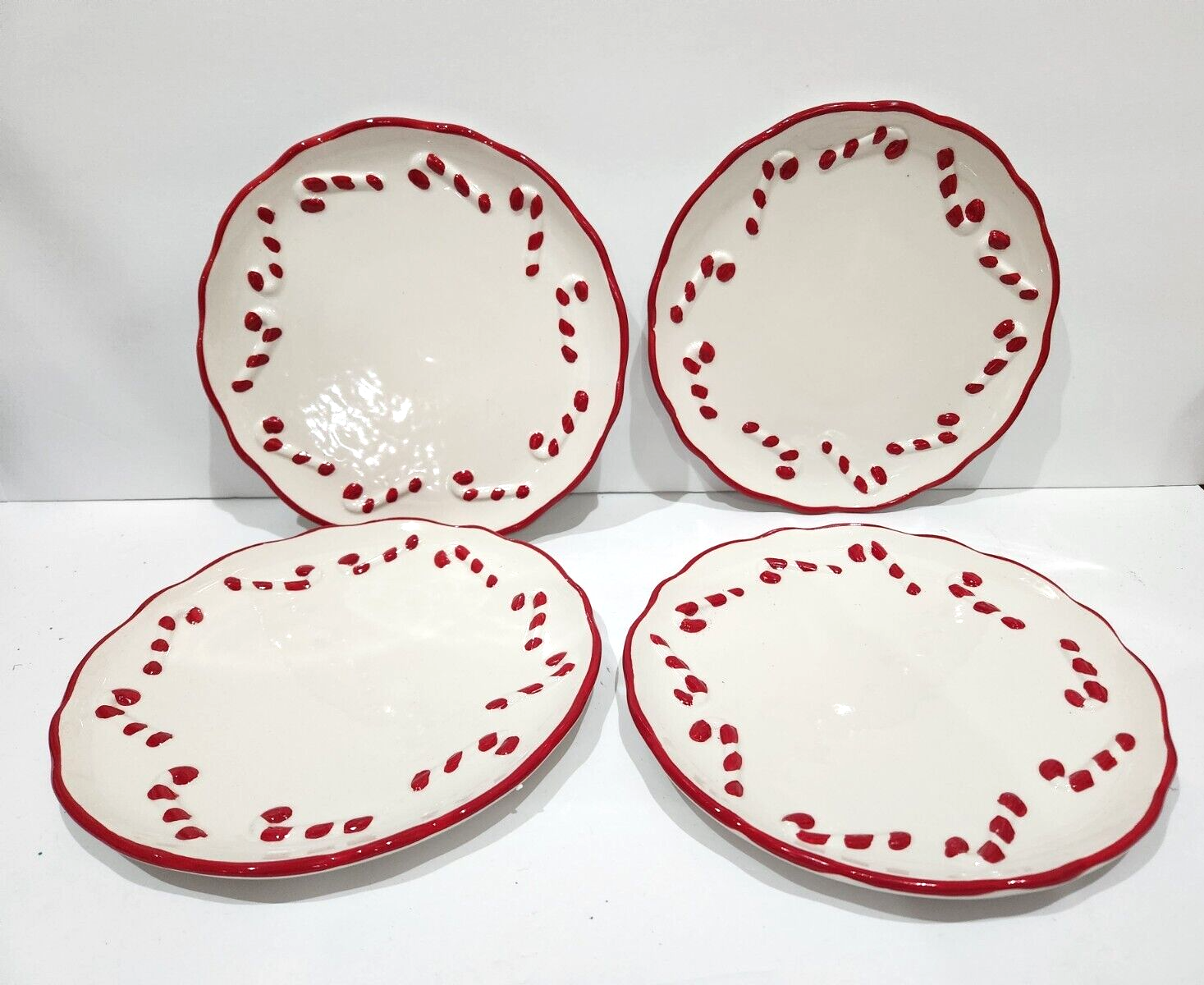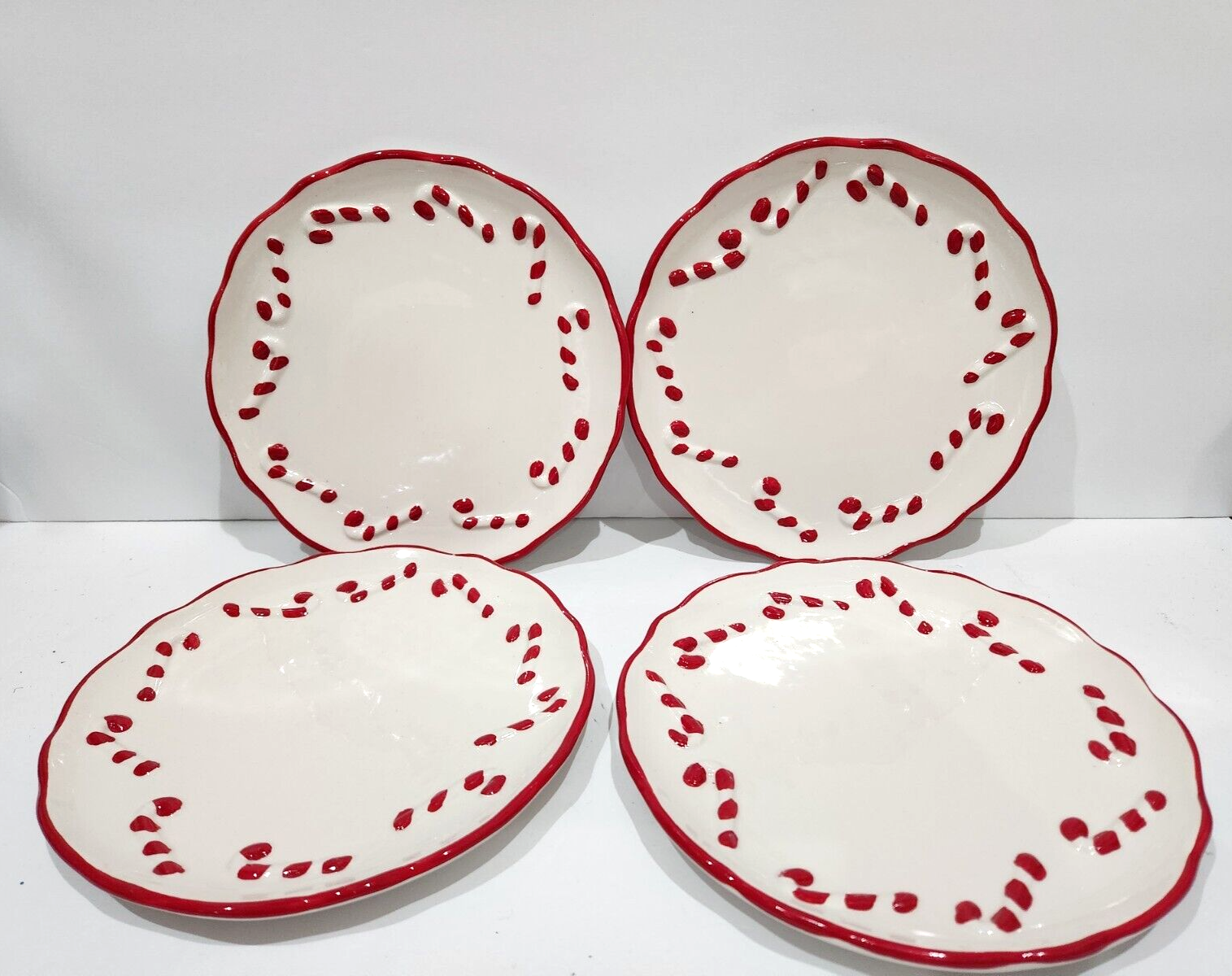 Up for sale we have a set of 4 ceramic plates. These plates are so cute. They have a candy cane desing and made of ceramic. The plates measure approx 8.5" in diameter. New set of 4