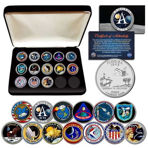 This ?APOLLO I? 2-coin complete set is a treasured collectible. These coins are Genuine Authentic Legal Tender of the United States, which have been beautifully enhanced with colorized images of APOLLO I Astronaut Crew and mission insignia. The 2-coin set includes a colorized JFK Kennedy Half Dollar coin plus a colorized 2004 Florida Statehood quarter. Each coin comes in a premium coin capsule. The set comes with a Certificate of Authenticity to guarantee that your coins are authentic and recognized by every monetary authority around the world, assuring its Collector Edition status. Colorizing coins involves the unique application of special inks directly to the surface of a coin that achieves a level of detail, color saturation, and durability that is #1 in the coin industry. The result is an everlasting colorized coin collectible of ultra-high quality.