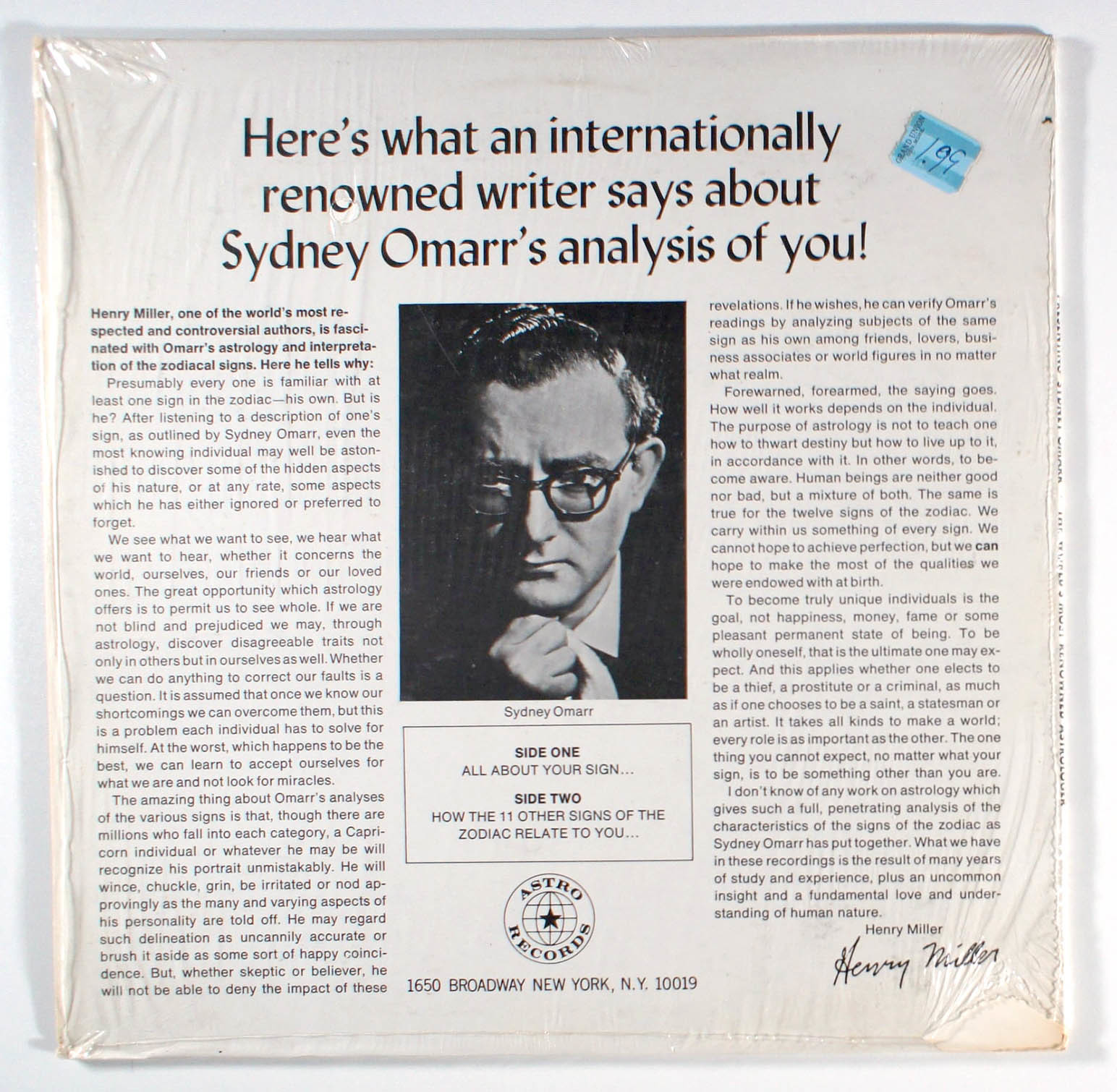 Aquarius, by Sydney Omarr, is a non-musical spoken word explanation of the horoscope by renowned writer Sydney Omarr. According to Henry Miller in liner notes, "I don't know of any work on astrology which gives such a full, penetrating analysis of the characteristics of the signs of the zodiac as Sydney Omarr has put together.What we have in these recordings is the result of many years of study and experiences plus an uncommon insight and a fundamental love and understanding of human nature."
