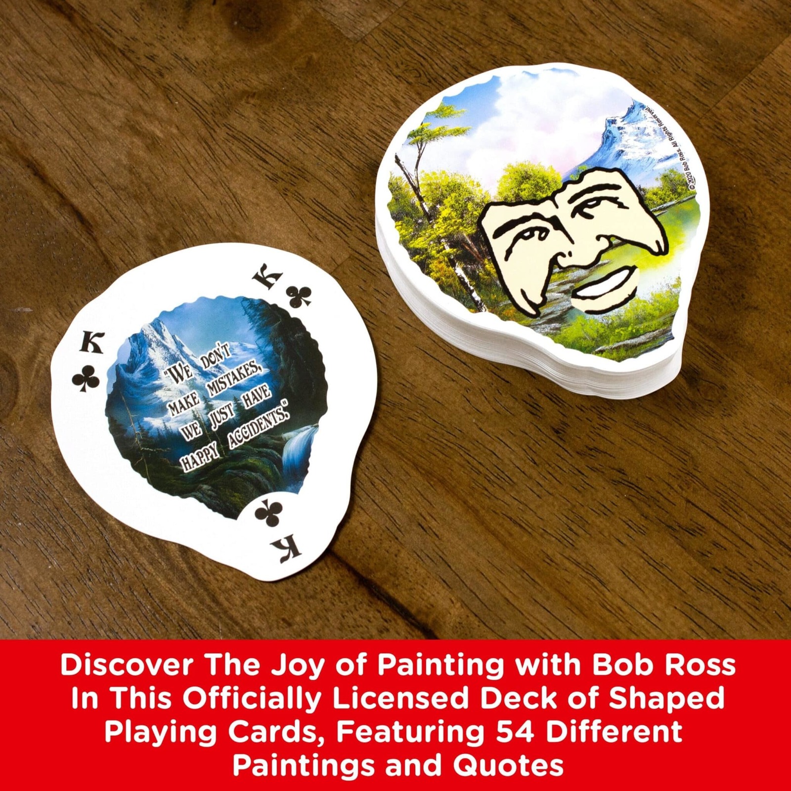 BOB ROSS SHAPED DECK OF PLAYING CARDS: Play your favorite card games with friends and family and discover the joy of painting with Bob Ross in this officially licensed deck of shaped playing cards, featuring 54 different paintings and quotes