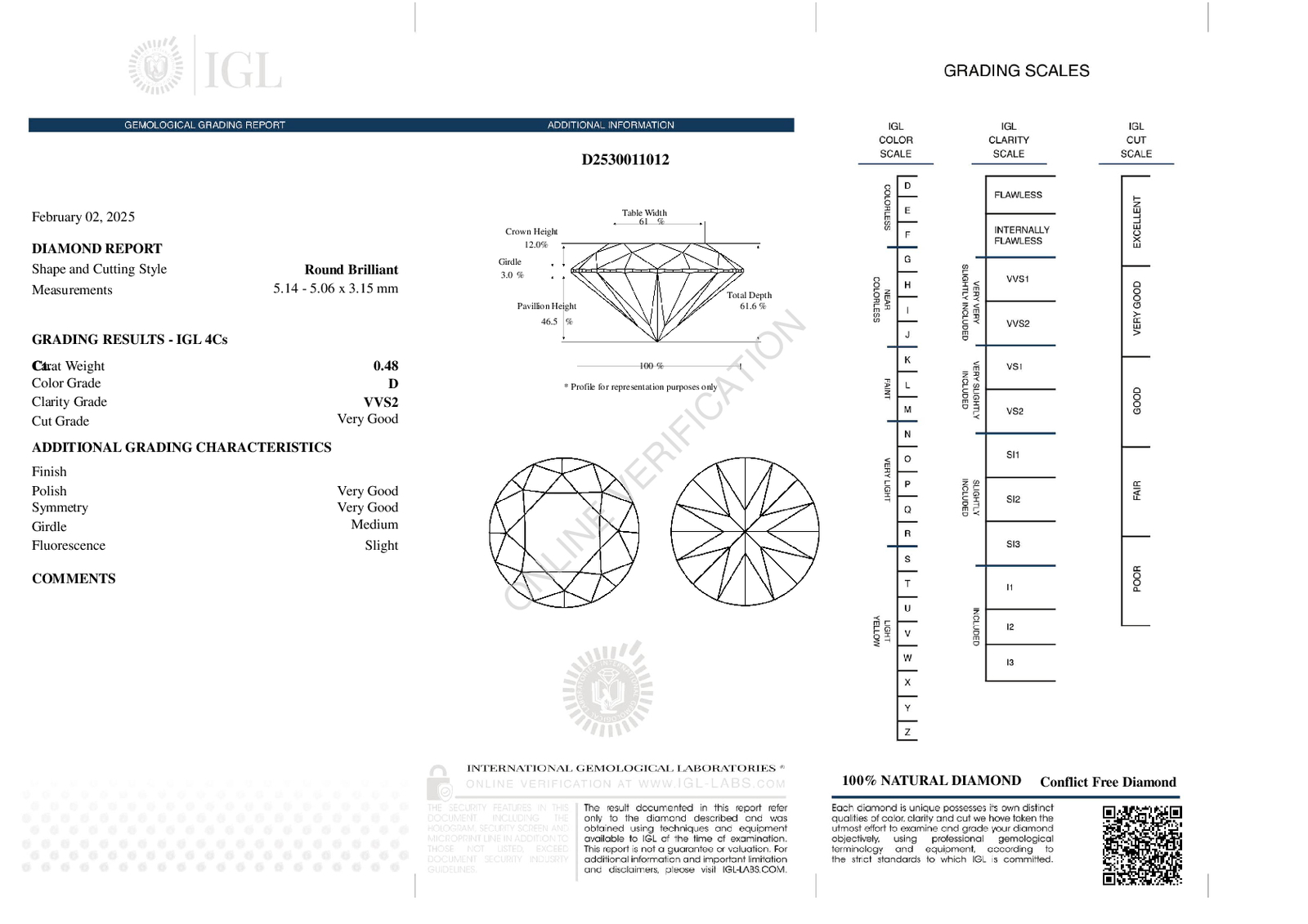 Diamond Information: Gem Type: Center Stone(s): Diamond Gem Creation Method: Earth Mined Stone Shape: Round Number Of Stones: 1 Color: D Clarity: VVS2 Stone Treatment: Center Stone(s):Not Treated Carat: 0.48 Ct Measurement: 5.14x5.06x3.15 Certificate Info: Cert Info: IGL Mini Cert - D2530011012 Cut: Very Good Symmetry: Very Good Polish: Very Good Fluorescence: Slight CaratsDirect2U #: 47004043