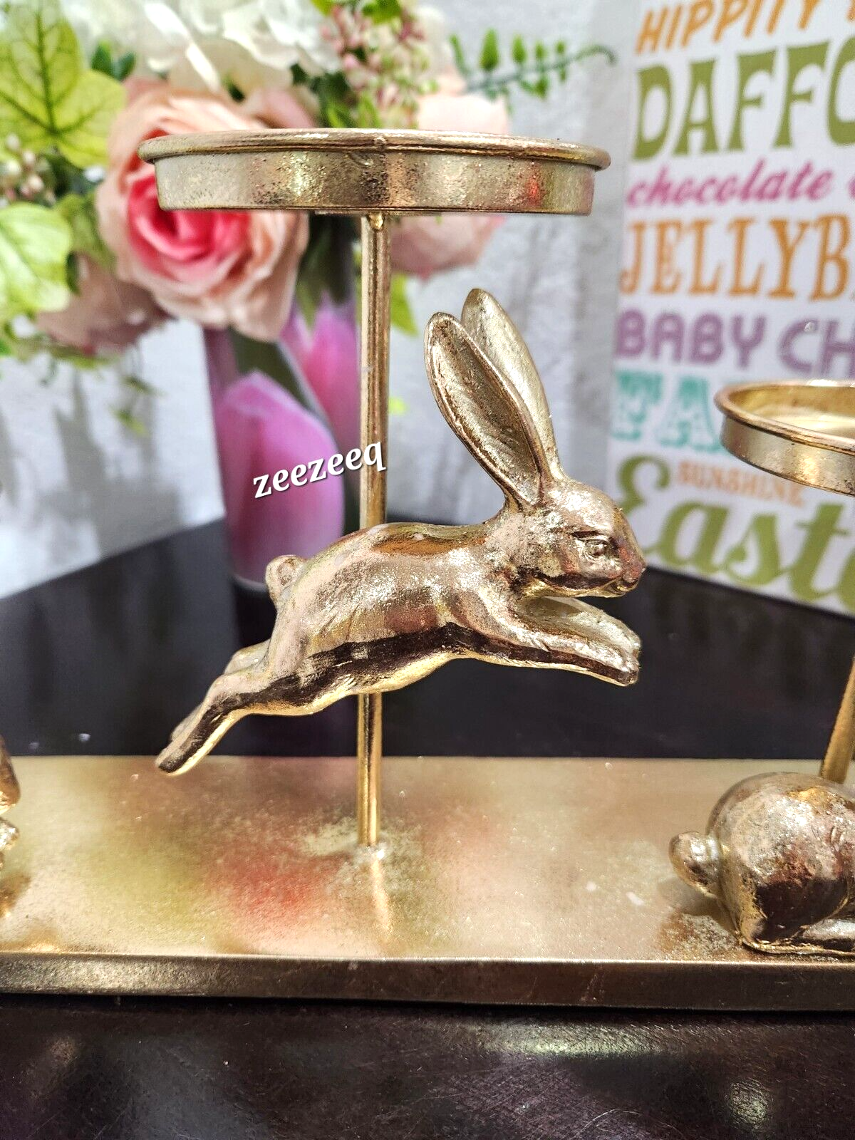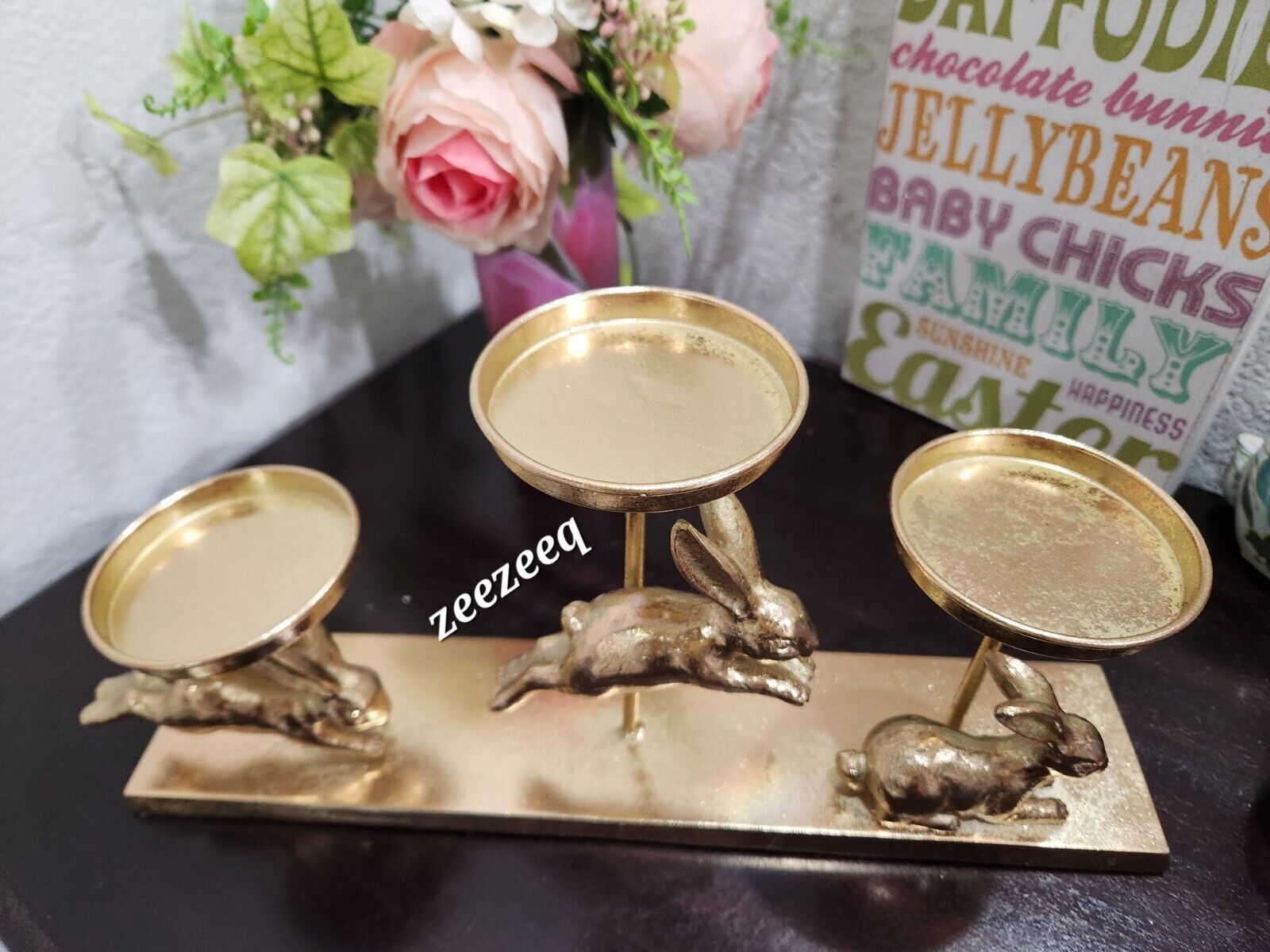 Up for sale we have this adorable gold bunny rabbit candle holder for your Easter tabletop decor. You can place 3 pillar candles (1 on each bunny). This piece will look stunnin gon your table. New