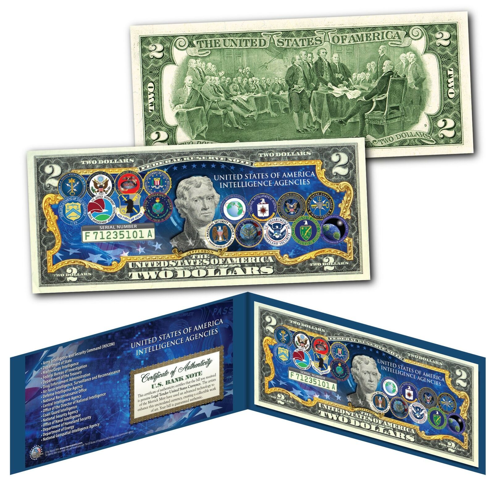 The 17 Intelligence Community agencies mission is to collect, analyze, and deliver foreign intelligence and counterintelligence information to America's leaders so they can make sound decisions to protect our country. It oversees the president, policy-makers, law enforcement, and the military. This National Security U.S. Intelligence Agencies uncirculated U.S. $2 Bill is Genuine Authentic Legal Tender of the United States, which has been enhanced with beautiful colorized images. The colorized images are accomplished through a revolutionary new authentic genuine colorization process pioneered by The Merrick Mint, creating a collectible work of art. Each bill comes displayed in a blue folio with a Certificate of Authenticity to guarantee that your bills are authentic and recognized by every monetary authority around the world, therefore assuring its Collector Edition status. Each $2 Bill is in FRESH, CRISP, UNCIRCULATED condition, and was directly removed from untouched wrapped Federal Reserve sealed packs. Former U.S. President Thomas Jefferson is featured on the obverse of the note, along with the special colorization overlay. The Signing of the Declaration of Independence by John Trumbull is featured on the reverse. It is the only U.S. Currency note that features two Presidents, John Adams and Thomas Jefferson, and it is one of the most rarely seen BILLS in circulation and actual use.