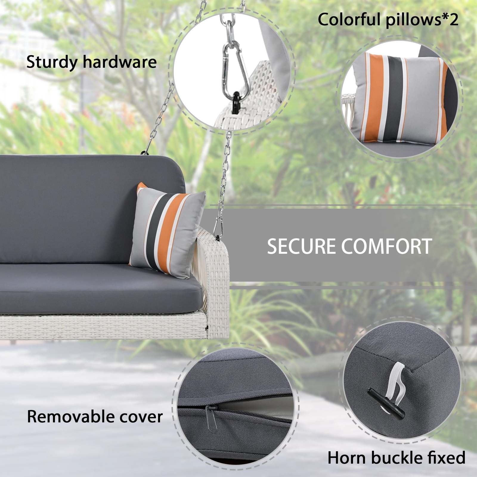 High-Level Safety: This outdoor porch swing features two durable metal chains for robust stability. Moreover, the inclusion of two metal chains, securely fastened to sturdy hooks via carabiners, ensures an added layer of security for your utmost safety.