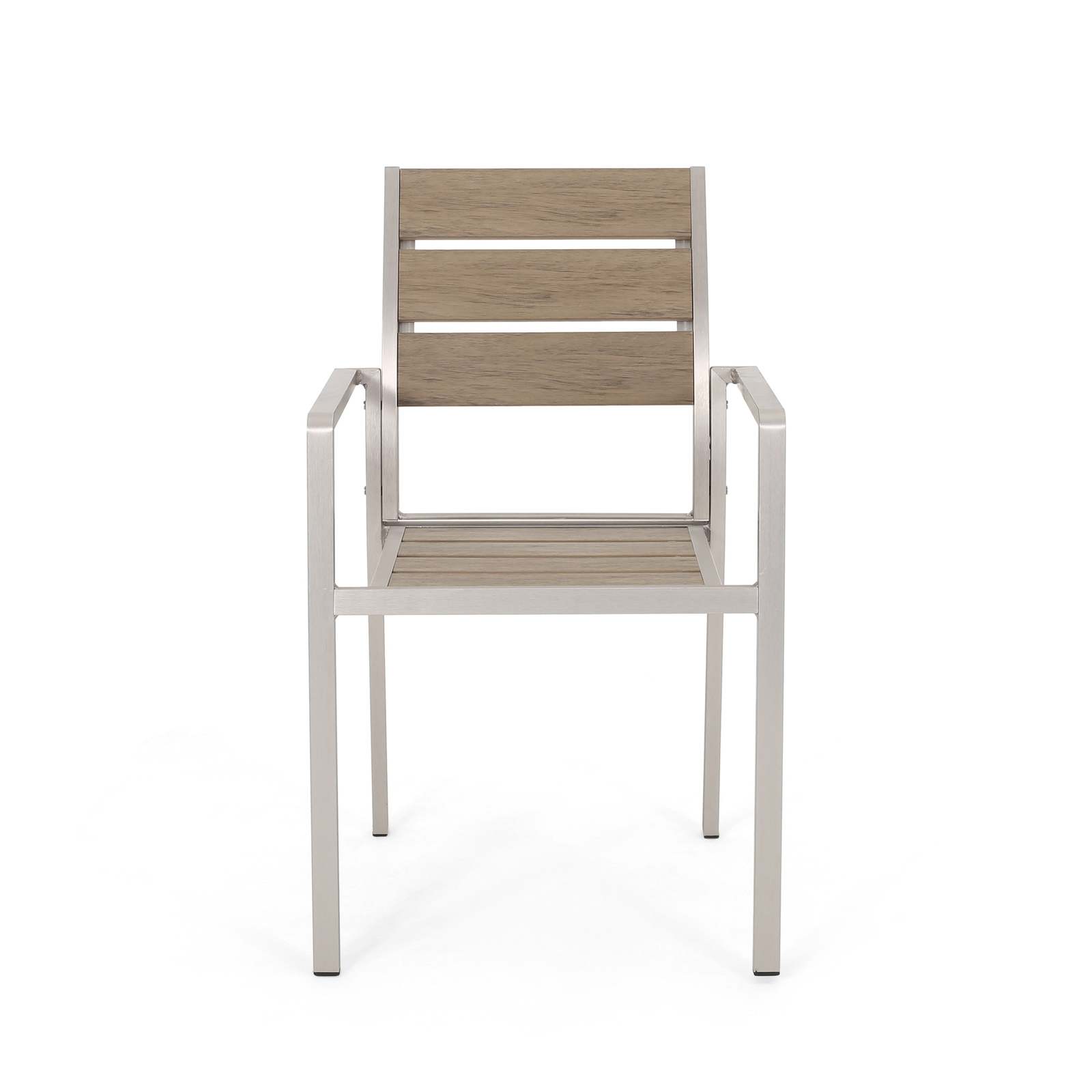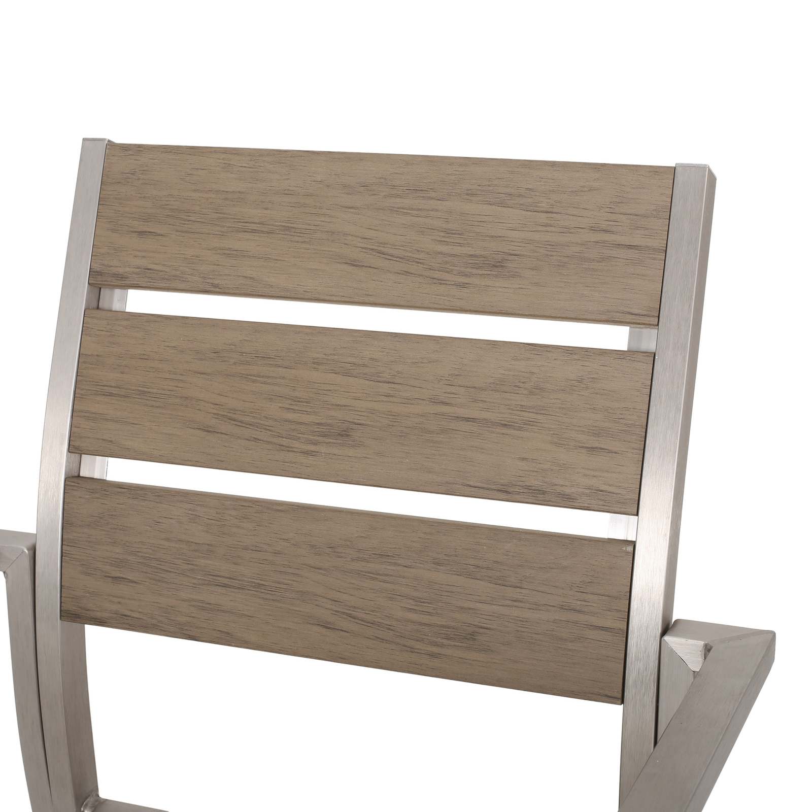 This dining chair boasts a sturdy construction made of faux wood and Aluminum, making it perfect for both indoor and outdoor use. Its detailed design blends seamlessly with any outdoor aesthetic, bringing a sense of refinement and sophistication to your area.
