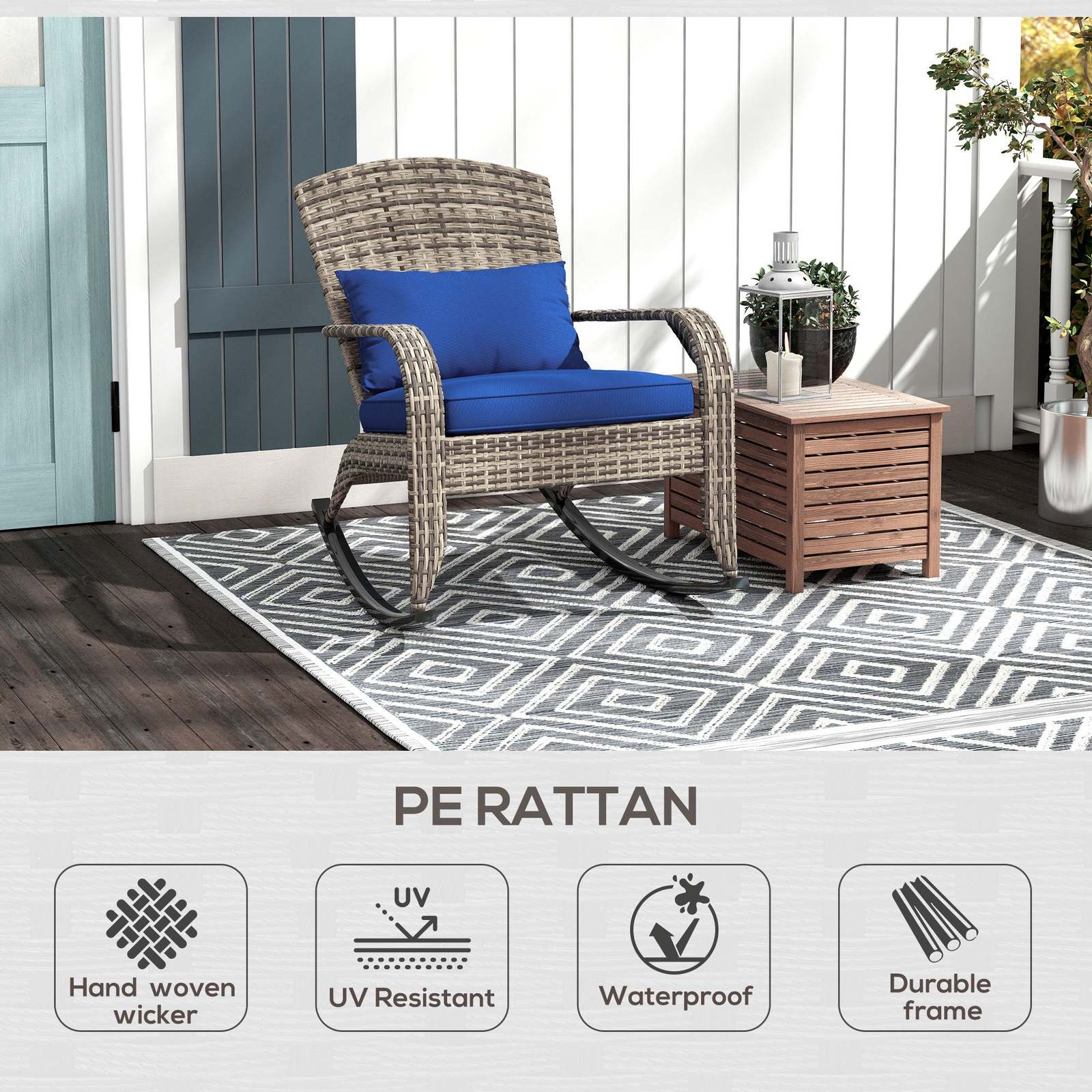 Wicker-Like Look: Hand-woven PE rattan gives our Adirondack rocking chair a classic wicker look. Place it indoors in the sunroom or outdoors on the patio, porch, garden, or deck. It's an instant accent piece.