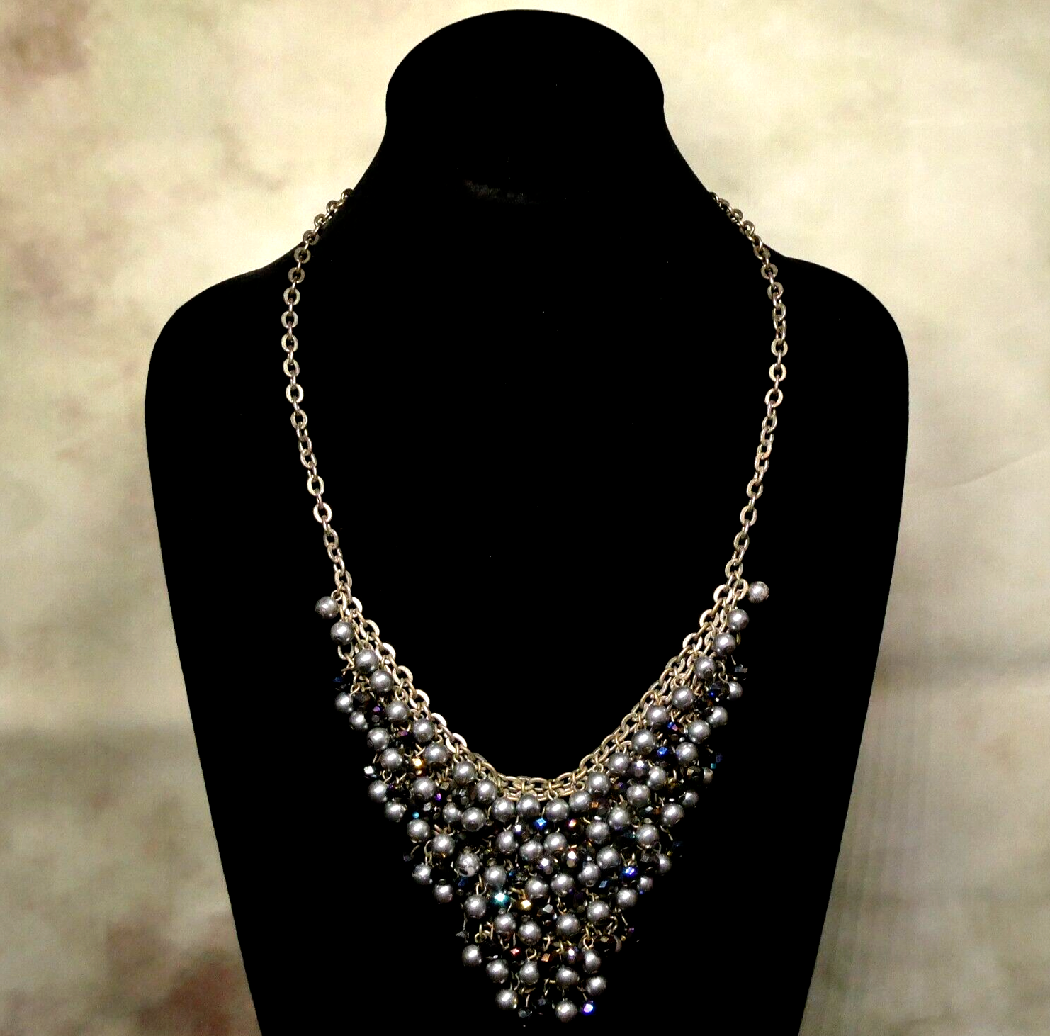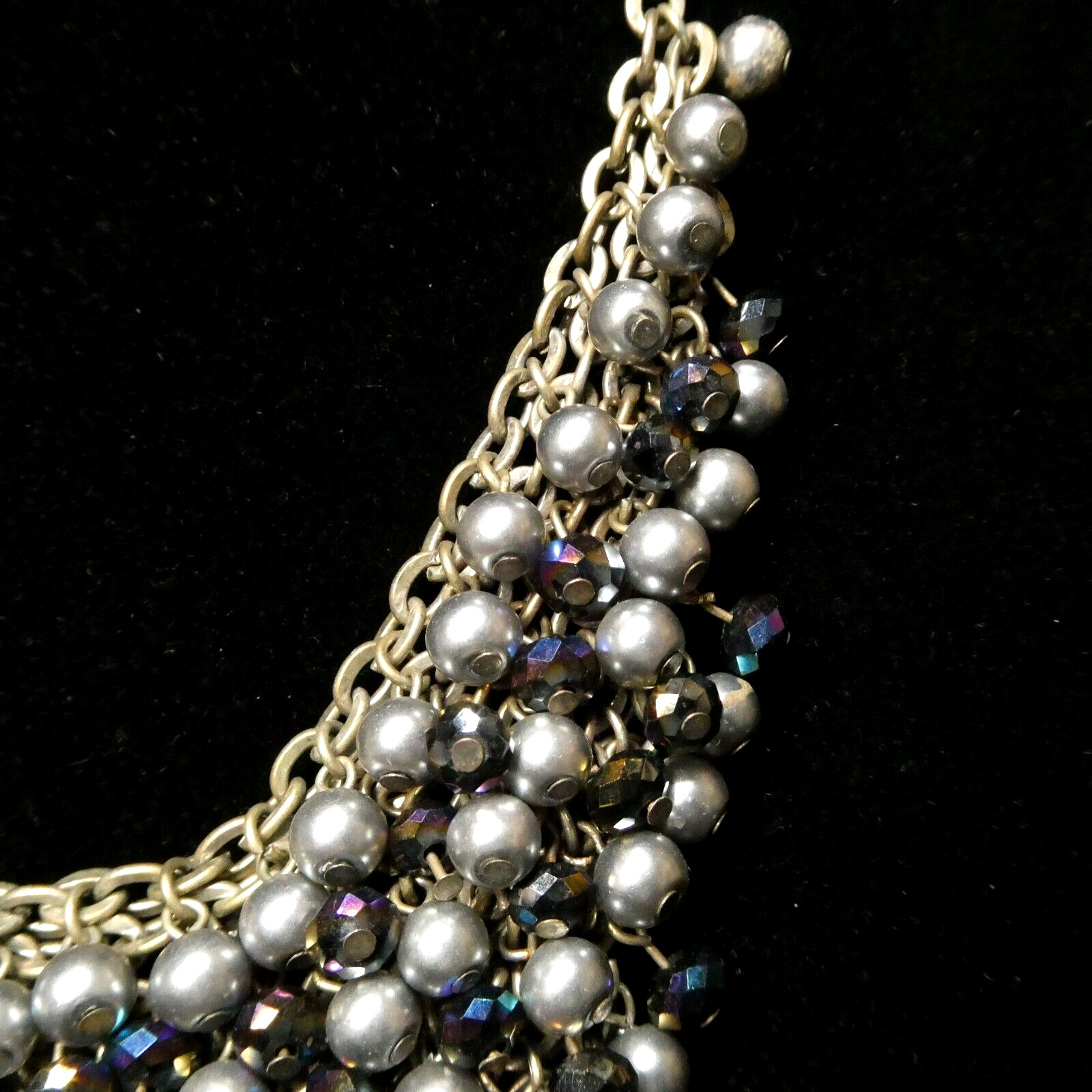 Up for sale: Metal Faux Pearl with Blue/Purple Beads Bib Cluster Necklace in good condition with the following features: