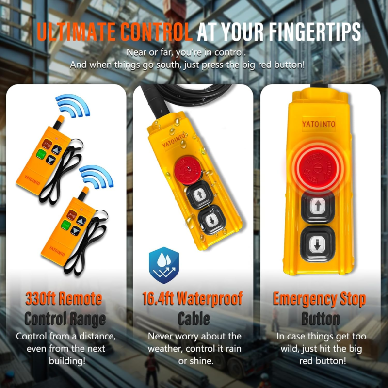 [MORE ADVANCED TECHNOLOGY] ? The latest electric hoist from YATOINTO features an upgraded 16.4ft wired remote control made with advanced waterproof materials and a red emergency stop button for enhanced safety. The wireless remote control range has been expanded from 200ft to 330ft, now including an additional remote for improved team coordination.