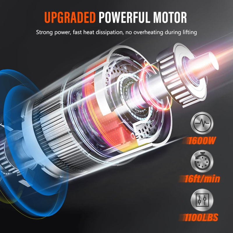 [ENHANCED STRENGTH] ? The hoist features a double hook (saddle hook) with an extended width from 1 inch to 2.2 inches, improving load distribution. Note: the upper single hook is not designed to bear loads. Powered by a robust 1600W universal motor, this 25lbs electric hoist can efficiently lift to 1,100lbs, though it may produce slightly higher noise levels during operation.