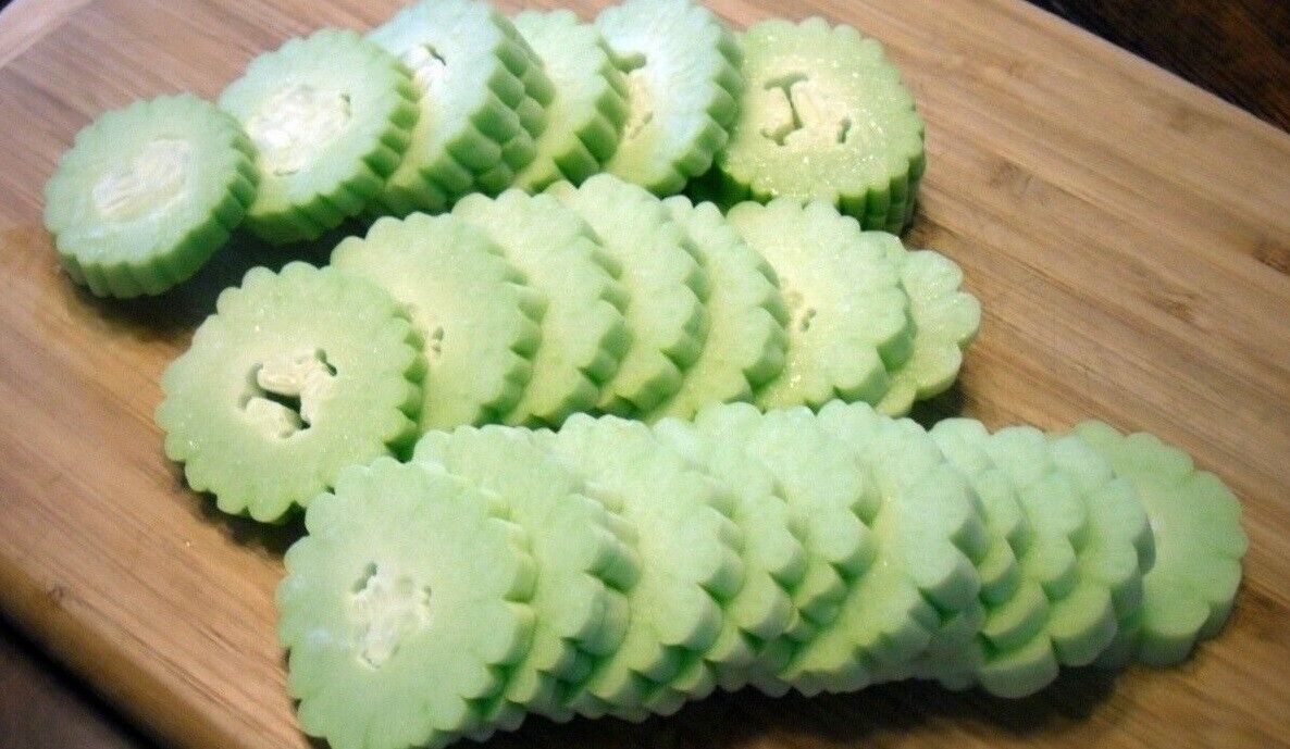 Mild flavored light green fruits can grow to enormous lengths. Tastes best when harvested 5 -12" inches. This is the longest cucumber available for purchase. Early bearing heavily-ribbed fruits are sweet and tender.