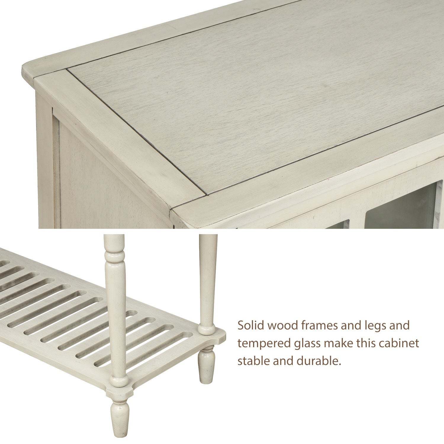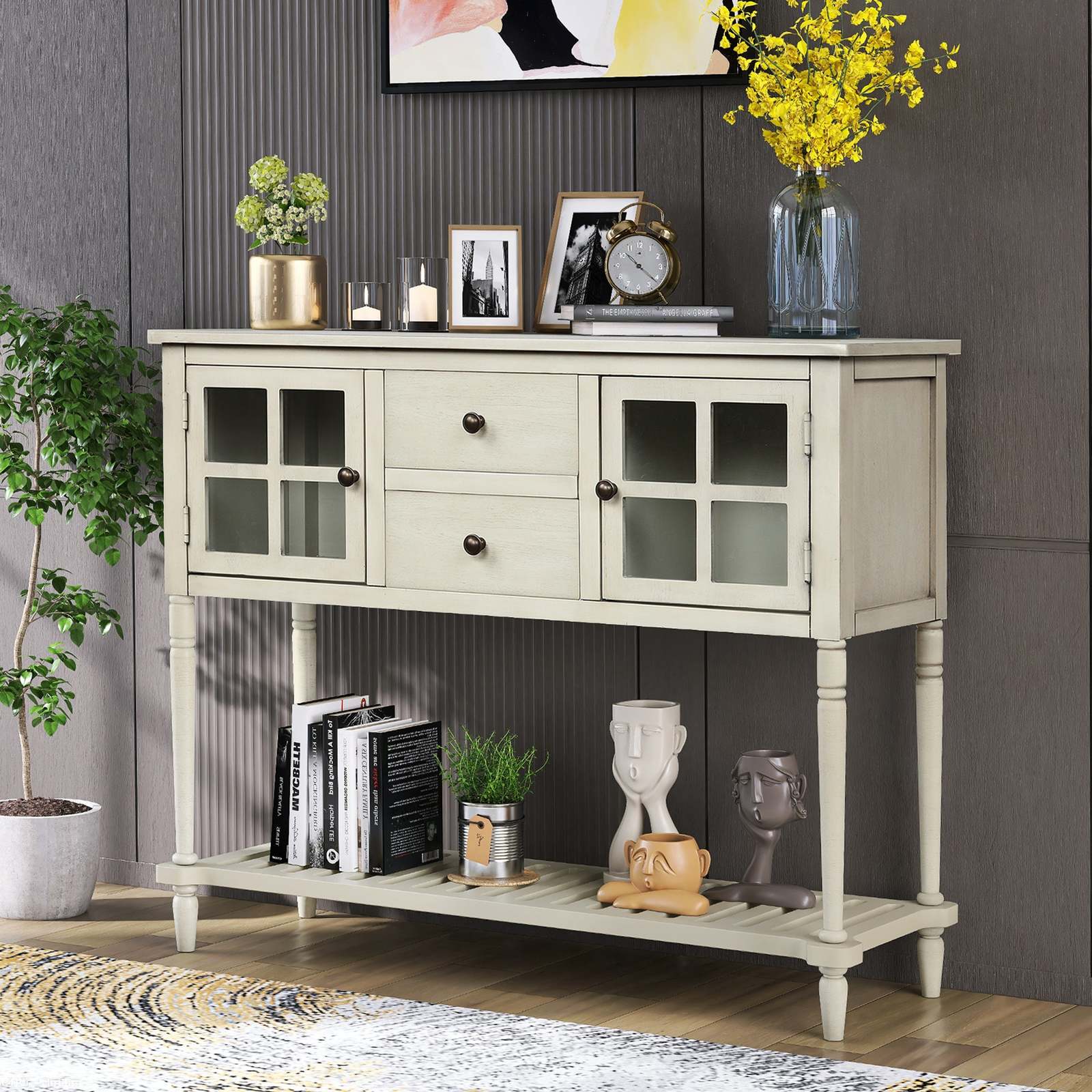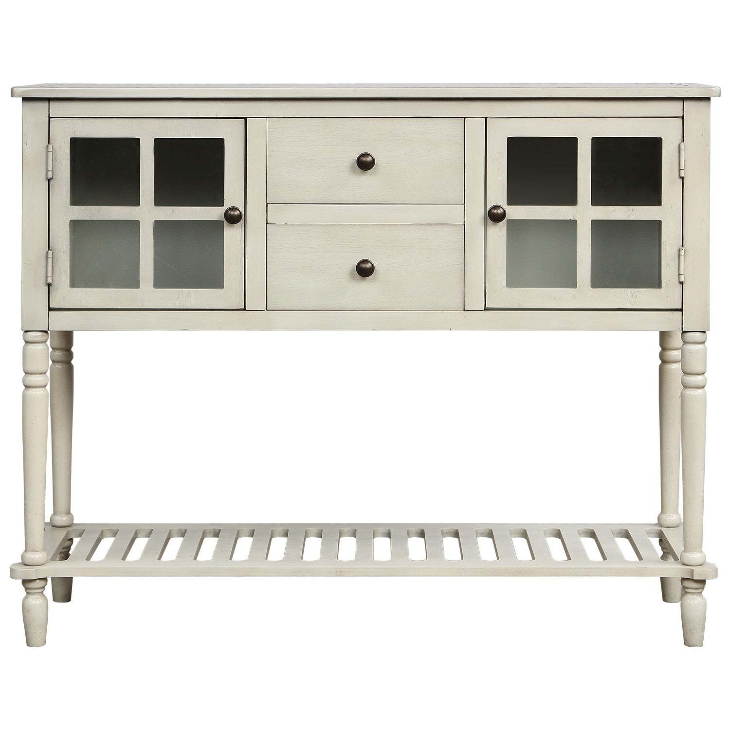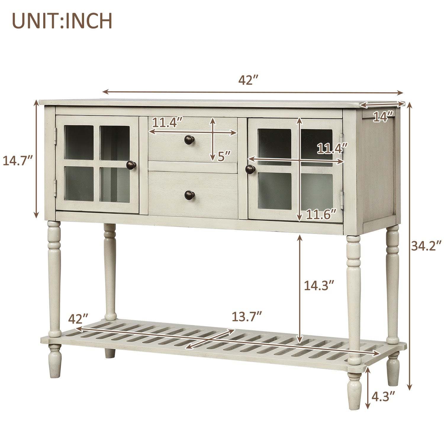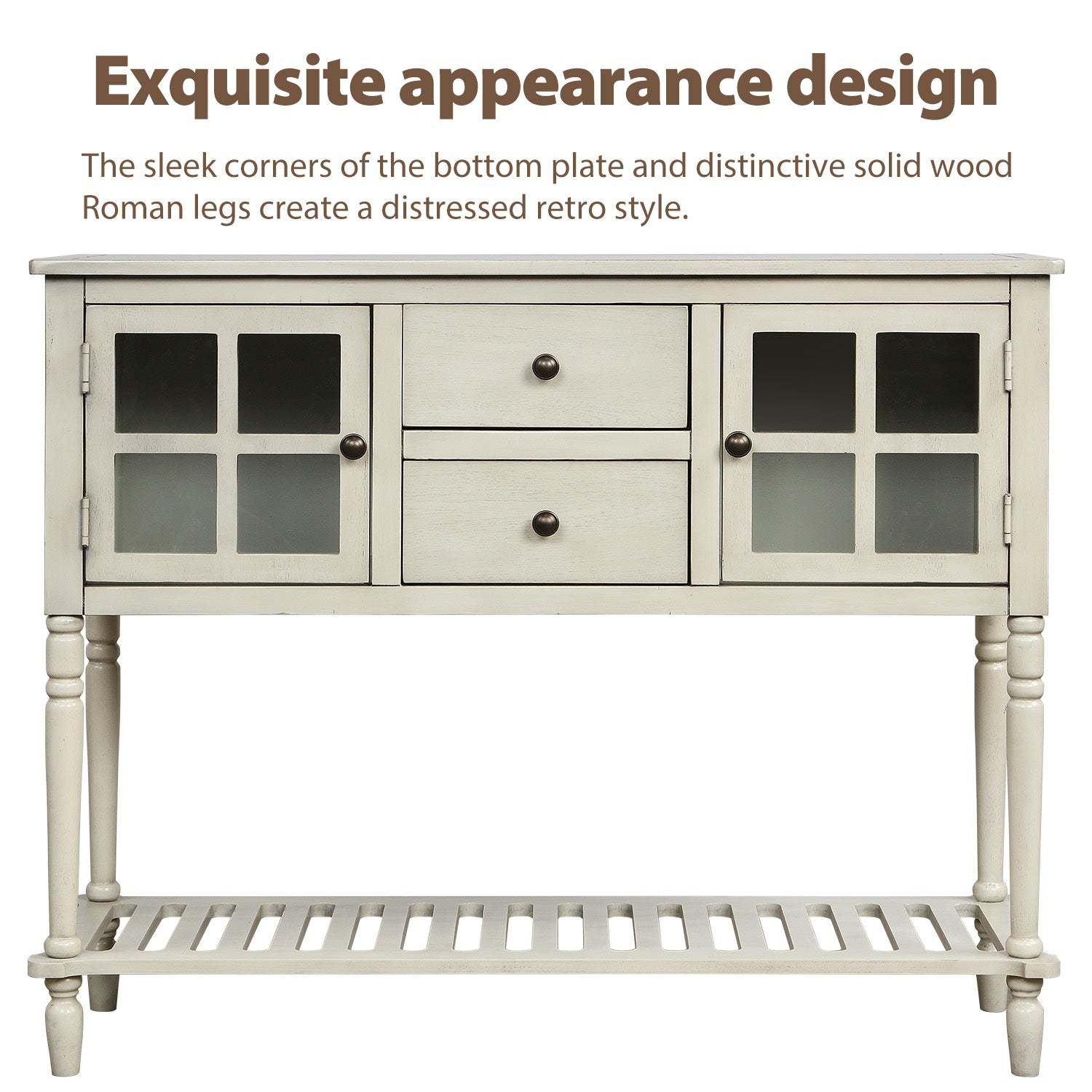 Featuring spacious open table top and bottom shelf, two glass-front cabinets and two drawers, this sideboard provide you enough storage space for your favorite decorations or books or for storing necessities and tableware.Exquisite appearance design, the sleek corners of the bottom plate and distinctive solid wood Roman legs create a distressed retro style.